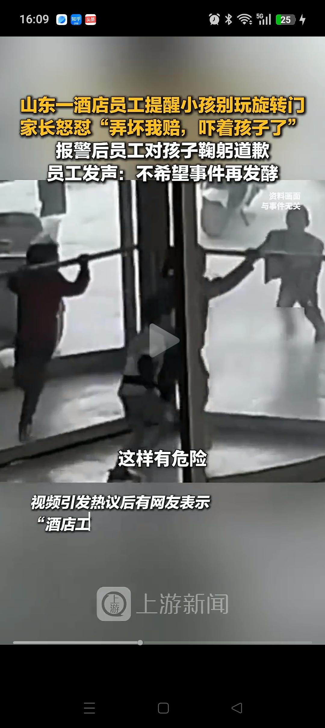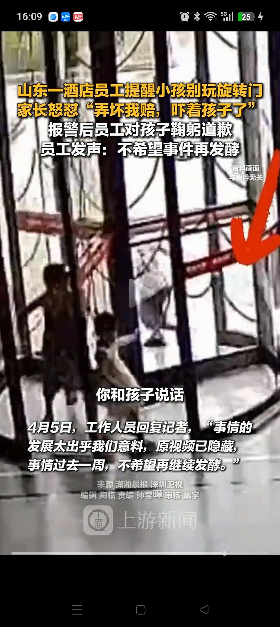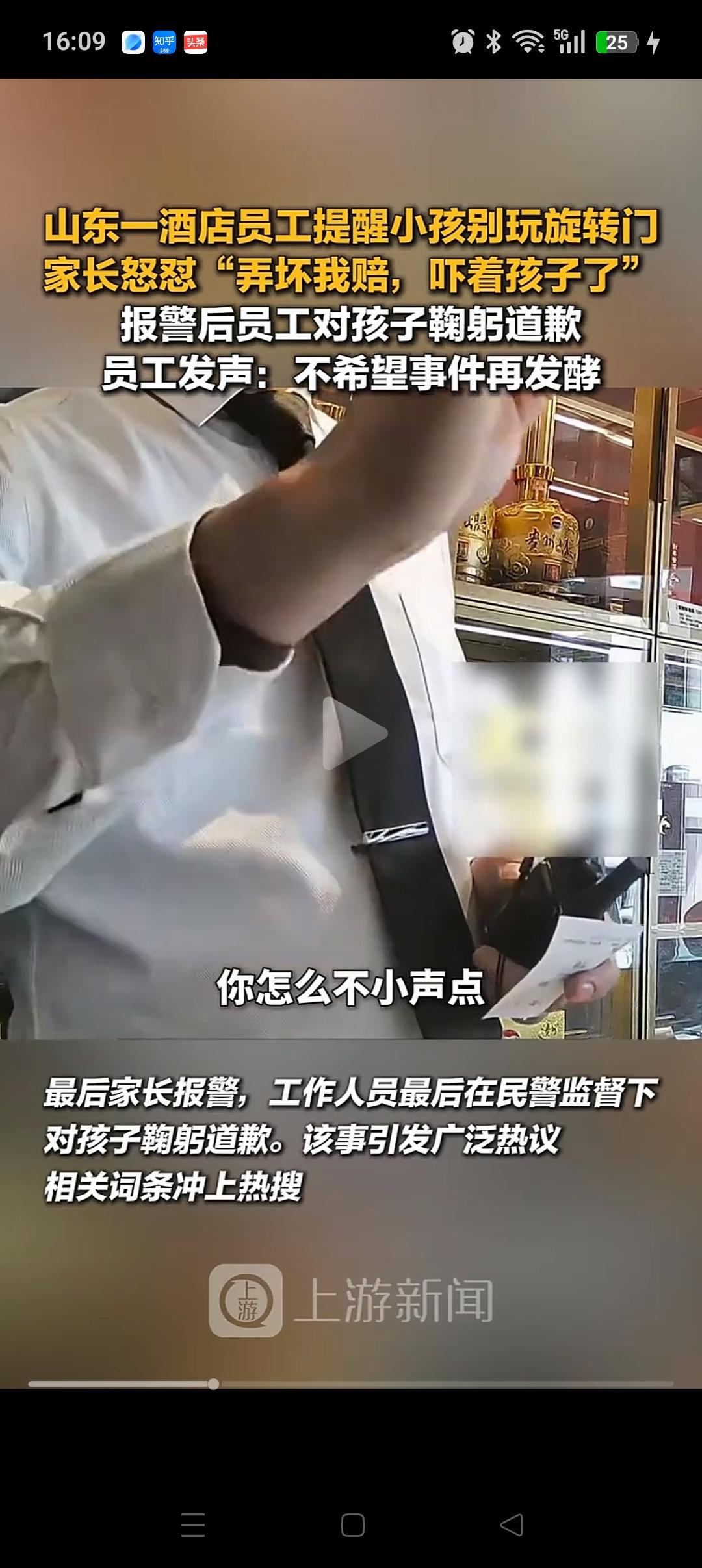 酒店员工提醒小孩别玩旋转门反被家长怒吼,要求道歉! 我感觉服务员以后都不会多管闲事了![流泪] 从视频里可以清楚的听到,明明男服务员的声音,非常的柔和,一点都不大。 但是这位家长却实在太过分了! 他一直说男服务员声音很大,应该说话小声点,而且是那种吼人的声音。 男服务员一再解释,自己只是出于安全考虑,才善意的提醒! 但是家长根本不听,不仅大吵大闹,还联系了帽子叔叔。 最后男服务员不得不鞠躬道歉! 其实正确的做法应该是家长道歉,服务员确实太委屈了!