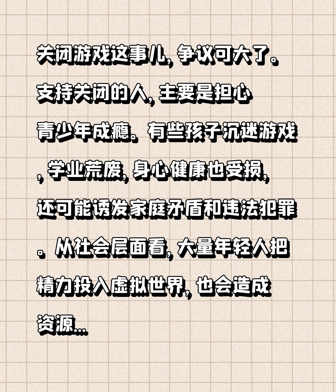 关闭游戏这事儿,争议可大了。支持关闭的人,主要是担心青少年成瘾。有些孩子沉迷游戏,学业荒废,身心健康也受损,还可能诱发家庭矛盾和违法犯罪。从社会层面看,大量年轻人把精力投入虚拟世界,也会造成资源浪费。对一些家长和监管者来说,关闭似乎是最直接的办法。