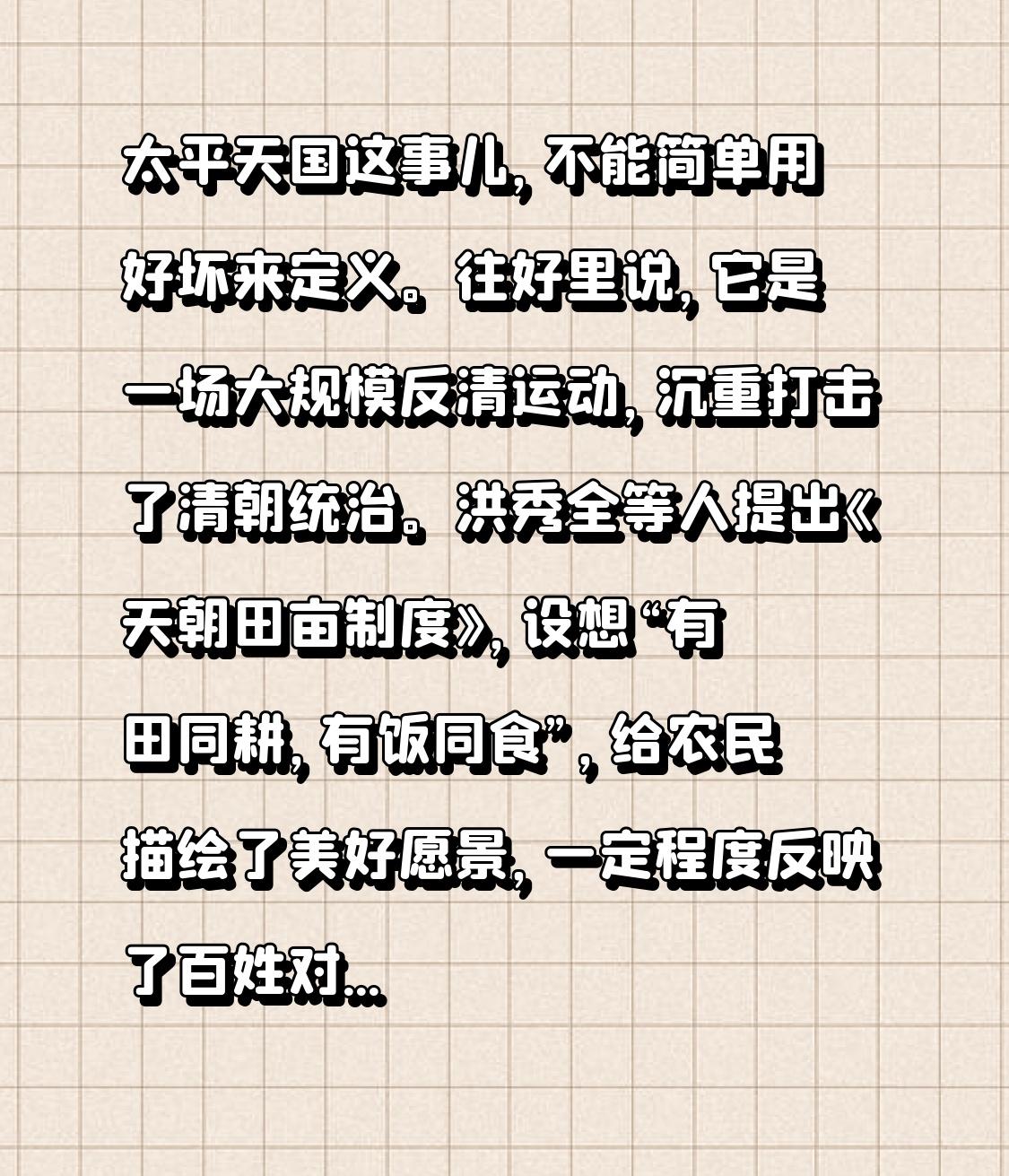 往好里说,它是一场大规模反清运动,沉重打击了清朝统治。洪秀全等人提出《天朝田亩制度》,设想“有田同耕,有饭同食”,给农民描绘了美好愿景,一定程度反映了百姓对平等的渴望。