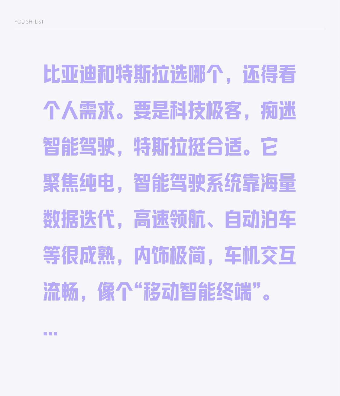 比亚迪和特斯拉选哪个,还得看个人需求。要是科技极客,痴迷智能驾驶,特斯拉挺合适。它聚焦纯电,智能驾驶系统靠海量数据迭代,高速领航、自动泊车等很成熟,内饰极简,车机交互流畅,像个“移动智能终端”。预算20万以上选纯电,Model 3/Y是个方向。
