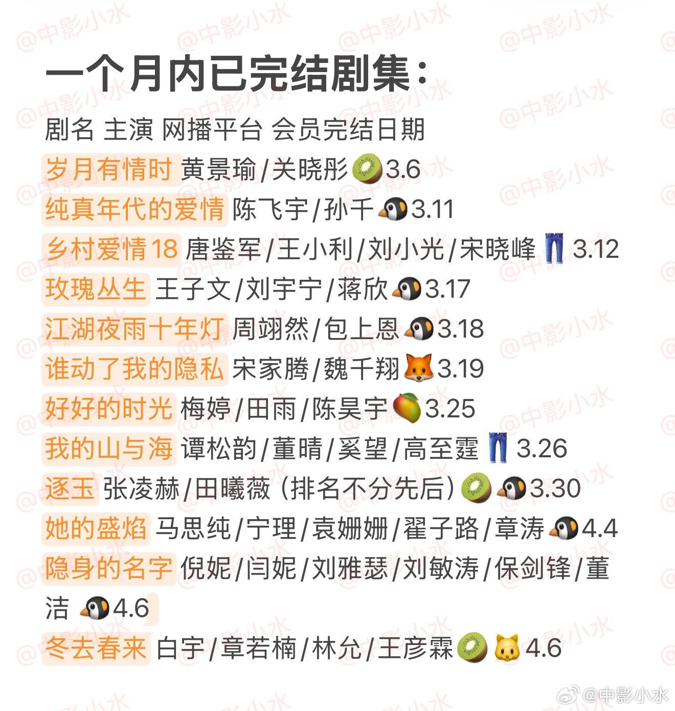 🈶正义女神 佘诗曼/谭耀文🈶你好1983 周也/翟潇闻 🈶白日提灯 迪丽热巴/陈飞宇🈶叵测 刘烨/聂远/王佳佳🈶月鳞绮纪 鞠婧祎/曾舜晞/陈都灵/田嘉瑞(排名不分先后)🈶钢铁森林 井柏然/蔡文静