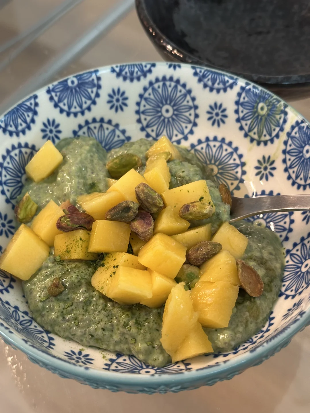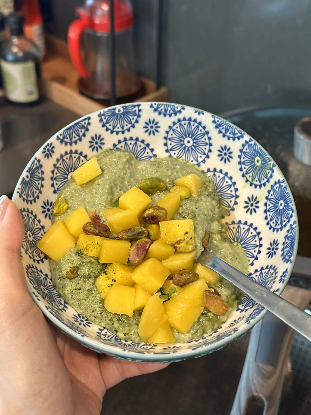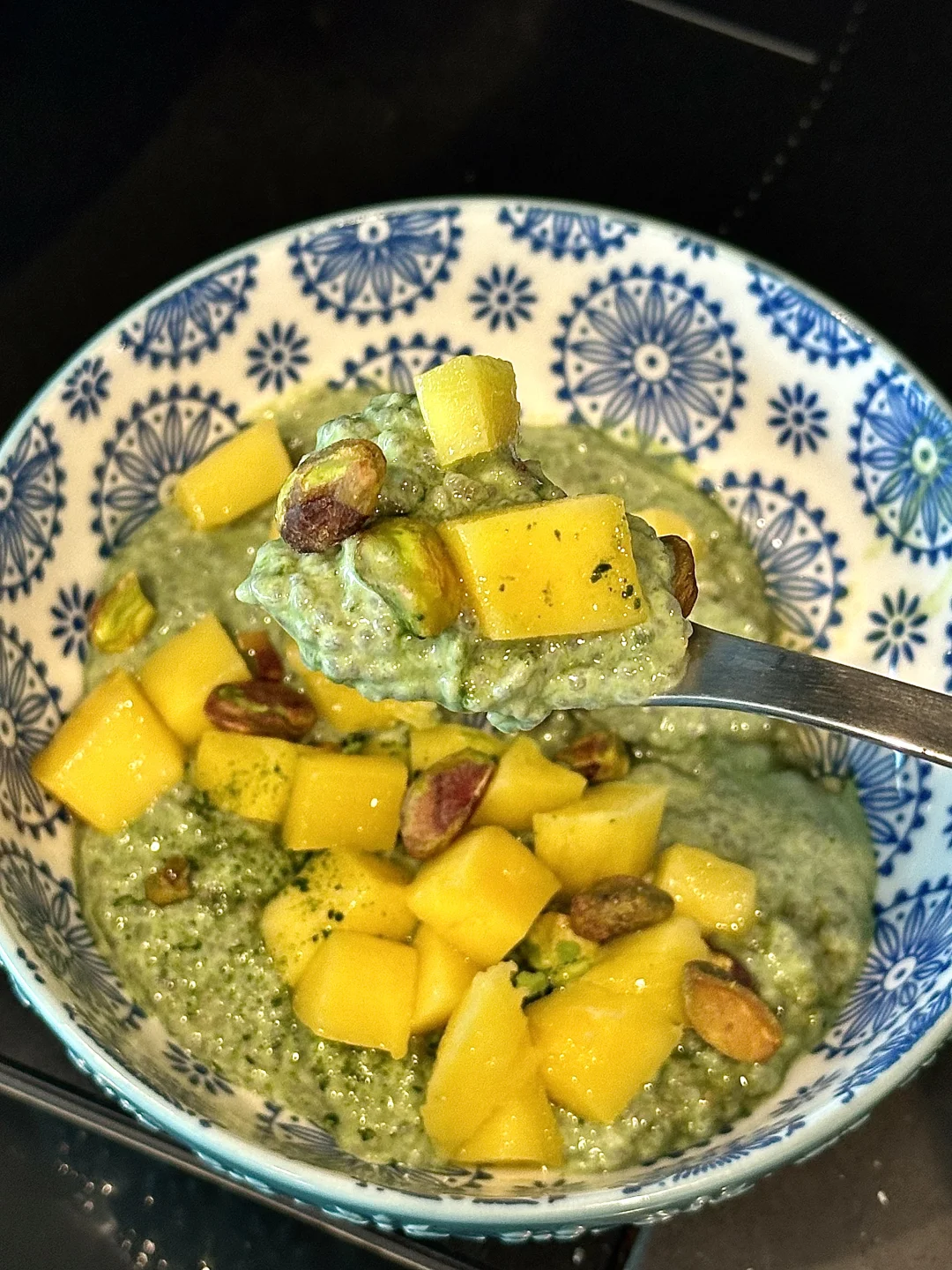 冷藏隔夜,就可以吃了!我觉得搭配新鲜芒果和开心果仁味道更香!