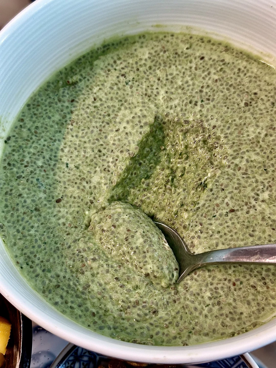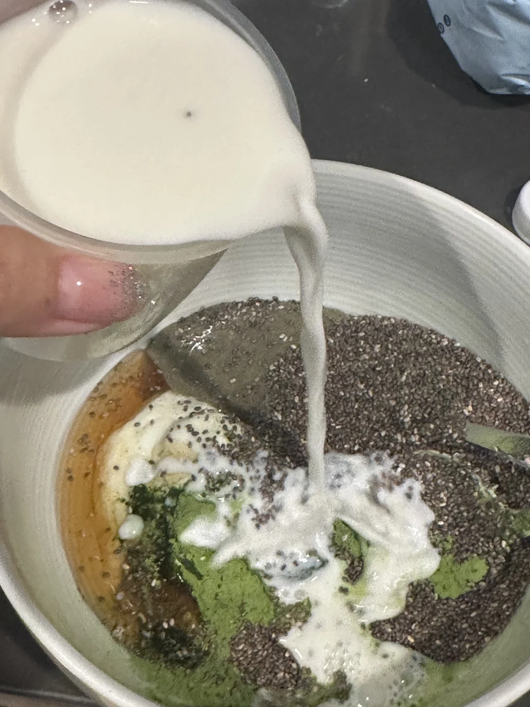 抹茶先用适量温牛奶打匀,这样质地更细腻些,然后把余下牛奶,酸奶,开心果酱,蜂蜜拌匀,再加入奇亚籽和少许盐拌匀;