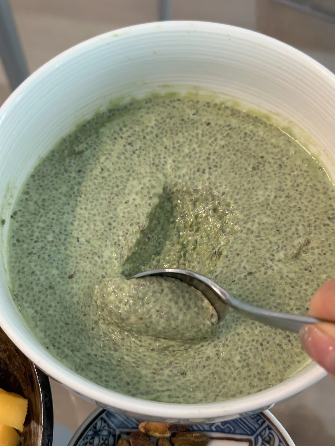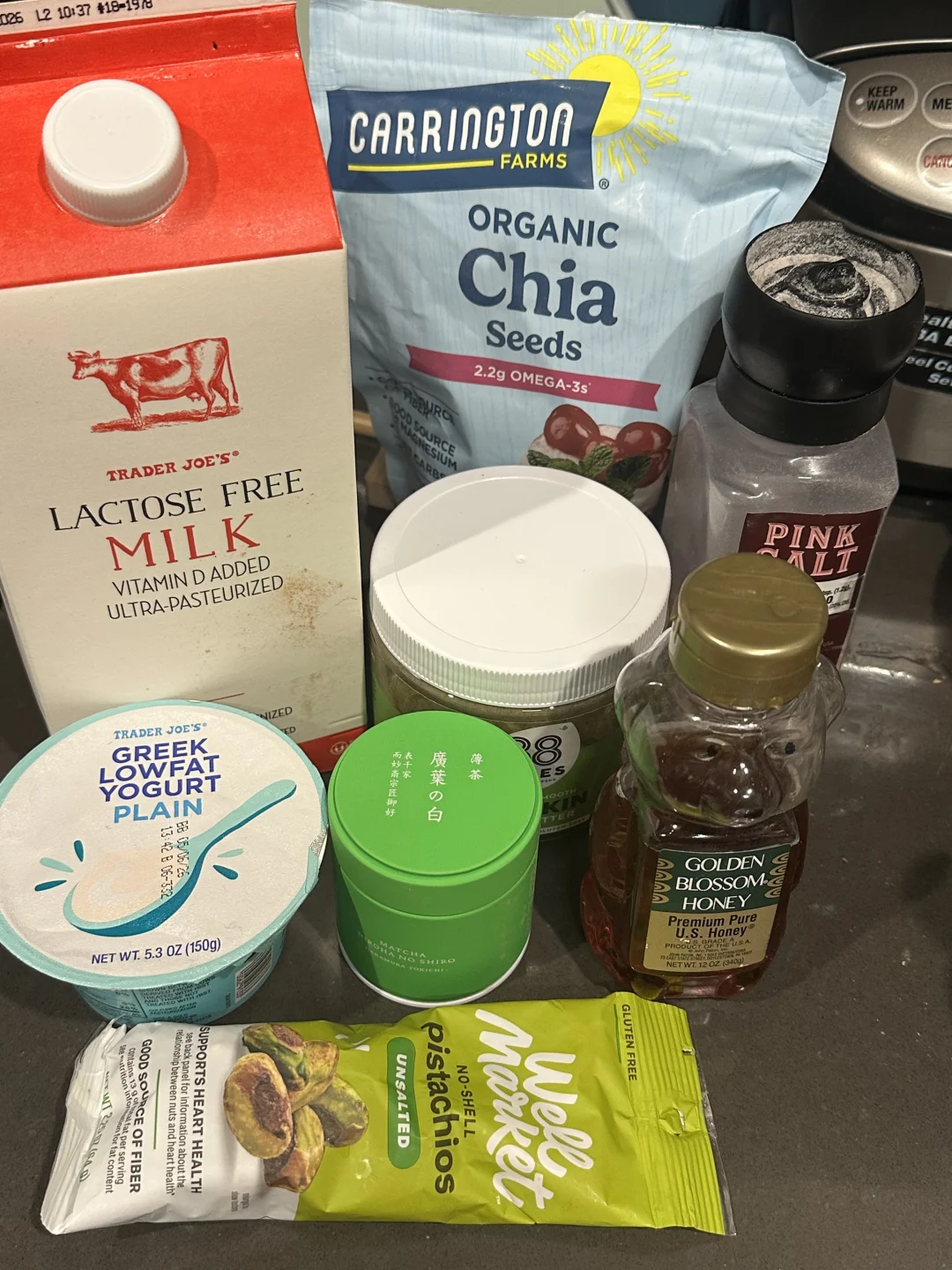 抹茶粉2tsp,全脂牛奶1cup,希腊酸奶一杯,开心果酱2tbsp,蜂蜜2tbsp,奇亚籽0.5cup,盐少许