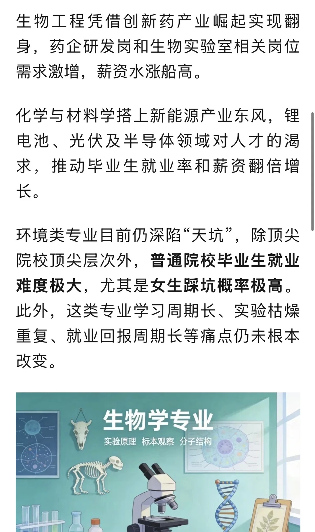 生物工程凭借创新药产业崛起实现翻身,药企研发岗和生物实验室相关岗位需求激增,薪资水涨船高。 化学与材料学搭上新能源产业东风,锂电池、光伏及半导体领域对人才的渴求,推动毕业生就业率和薪资翻倍增氐。 环境类专业目前仍深陷“天坑”,除顶尖院校顶尖层次外,普通院校毕业生就业难度极大,尤其是女生踩坑概率极高。 此外,这类专业学习周期长、实验枯燥重复、就业回报周期长等痛点仍未根本改变。 生