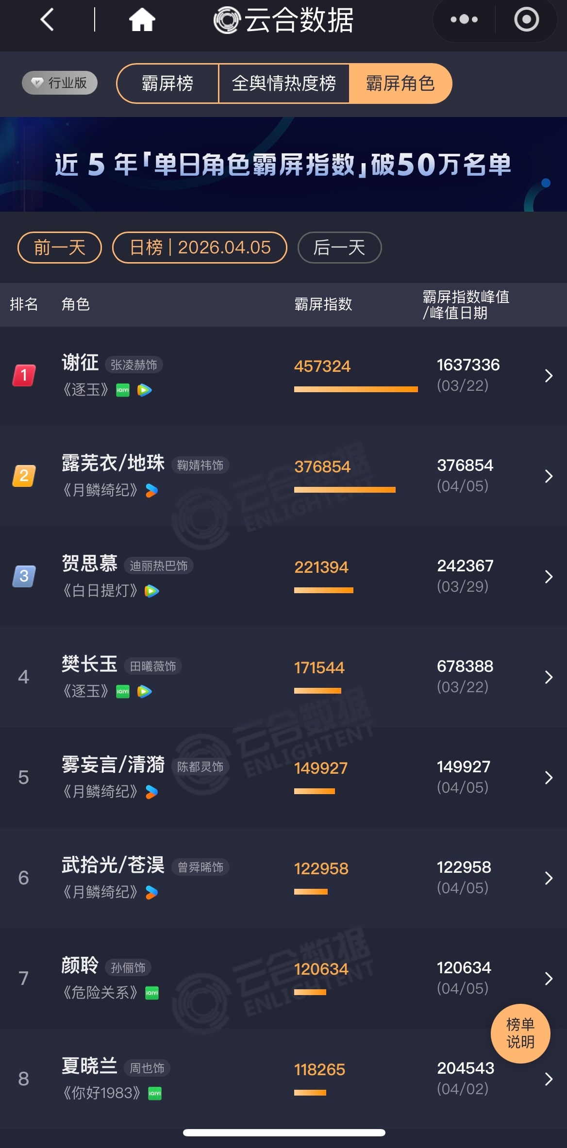 昨日云合剧集《逐玉》还是第一,第二是《月鳞绮纪》,第三《白日提灯》综艺五哈第一,浪姐第二,无限超越班4第三角色谢征第一,露芜衣第二,贺思慕第三