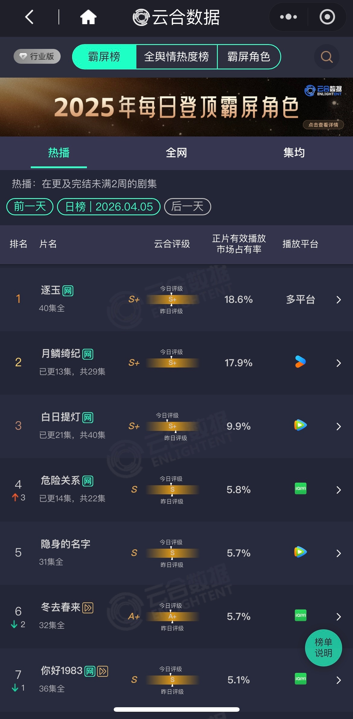 昨日云合剧集《逐玉》还是第一,第二是《月鳞绮纪》,第三《白日提灯》综艺五哈第一,