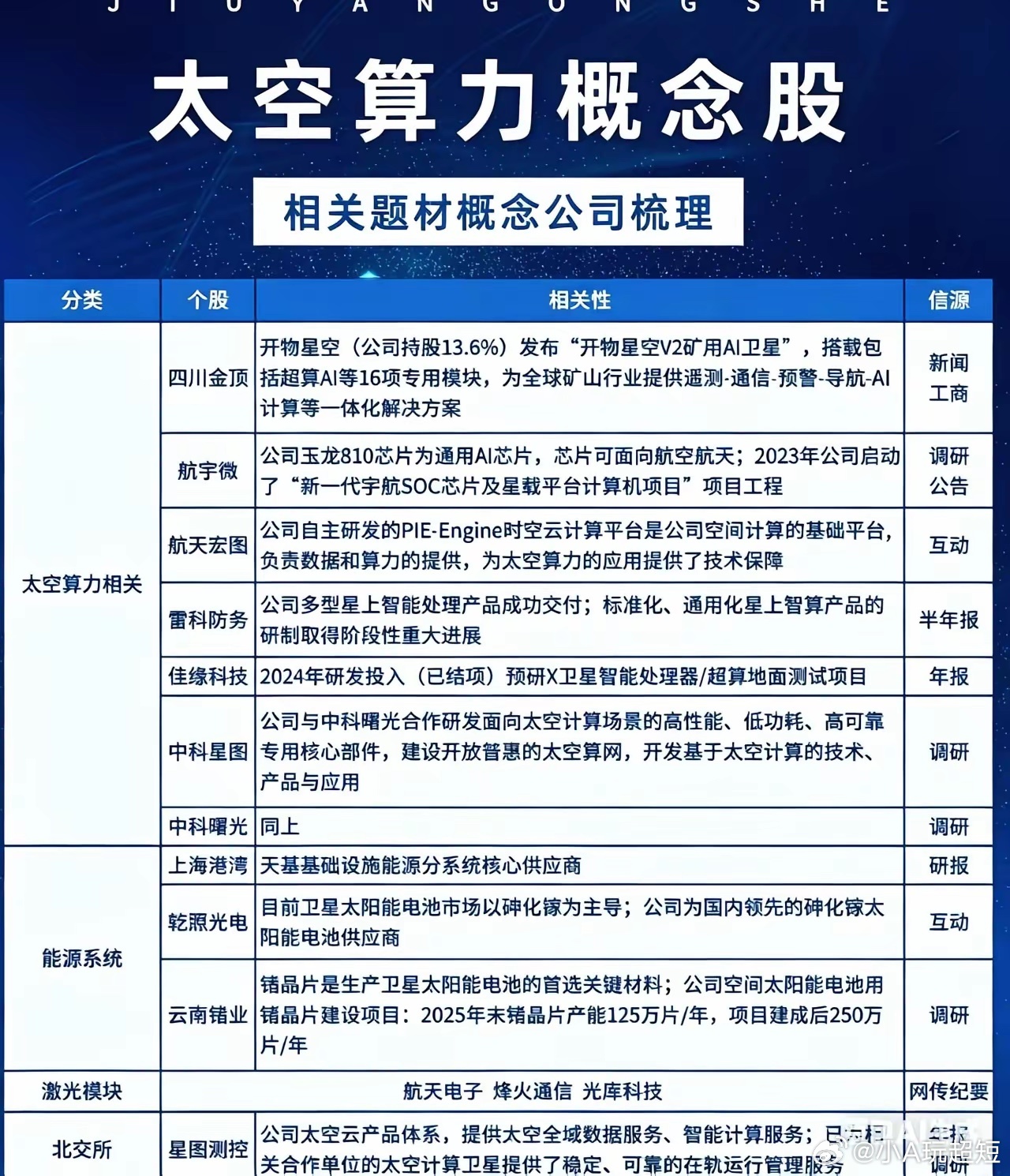 太空算力:下一个万亿级科技投资赛道随着AI算力需求爆发与商业航天成熟,太空算力正从概念走向现实,成为全球科技与资本角逐的下一个核心赛道。它凭借天然优势、政策加持与国际巨头押注,有望开启算力产业的太空新纪元。一、天生优势:颠覆地面算力的核心逻辑太空算力是将计算中心部署于近地轨道,通过卫星星座组网形成天基算力网络,核心优势无可替代:- 覆盖无死角:突破地形与地域限制,实现全球海洋、沙漠、极地全域覆盖。- 传输低延迟:星间激光通信+在轨实时处理,时延压缩至毫秒级,远快于地面光缆。- 自然冷却:太空真空超低温环境,无需水冷风冷,冷却成本近乎为零。- 能源高效:太阳能24小时稳定供电,效率是地面5倍以上,彻底摆脱能源瓶颈。二、政策东风:国家战略级赛道加速推进我国已将太空算力上升至战略高度,政策与产业协同发力:- 工信部明确表态,将系统谋划、前瞻布局,推动太空算力产业高质量发展 。- 全国首个太空算力专委会成立,统一标准、攻克“卡脖子”技术。- 央视等主流媒体密集报道,“星算计划”“三体计算星座”等项目快速落地。- 北京等地区投入巨资,建设国家级创新中心,集中攻关星载芯片、激光通信等核心技术。三、全球竞速:马斯克重磅押注,产业爆发在即国际层面,太空算力已成大国科技博弈焦点。马斯克旗下SpaceX计划部署百万颗卫星构建太空算力网络,依托星链与星舰,打造全球轨道数据中心,明确表态“太空算力2-3年内将成现实”。高盛、微软等巨头纷纷试点,高频交易、AI推理等场景已落地验证。国内产业同步提速,卫星制造、星载芯片、激光通信等全产业链爆发,A股已形成清晰投资主线:- 卫星制造:中国卫星(600118),小卫星龙头,算力卫星核心供应商。- 星载芯片:寒武纪(688256)、航宇微(300053),宇航级AI芯片核心标的。- 激光通信:光迅科技(002281)、华工科技(000988),星间高速通信关键。- 核心部件:复旦微电(688385)、铖昌科技(001270),抗辐照与射频芯片龙头。四、投资展望:长期赛道,把握核心主线太空算力正处于产业爆发初期,兼具科技成长与政策红利双重属性。短期看,试验星批量发射、技术验证加速;中长期看,2027-2030年将迎规模化商用,市场规模望破千亿。投资应聚焦国家队+技术壁垒标的,优先布局卫星制造、核心芯片、通信链路等上游环节,规避纯概念炒作。免责声明:本文仅为产业与投资逻辑分析,不构成任何投资建议。股市有风险,投资需谨慎,据此操作盈亏自负。