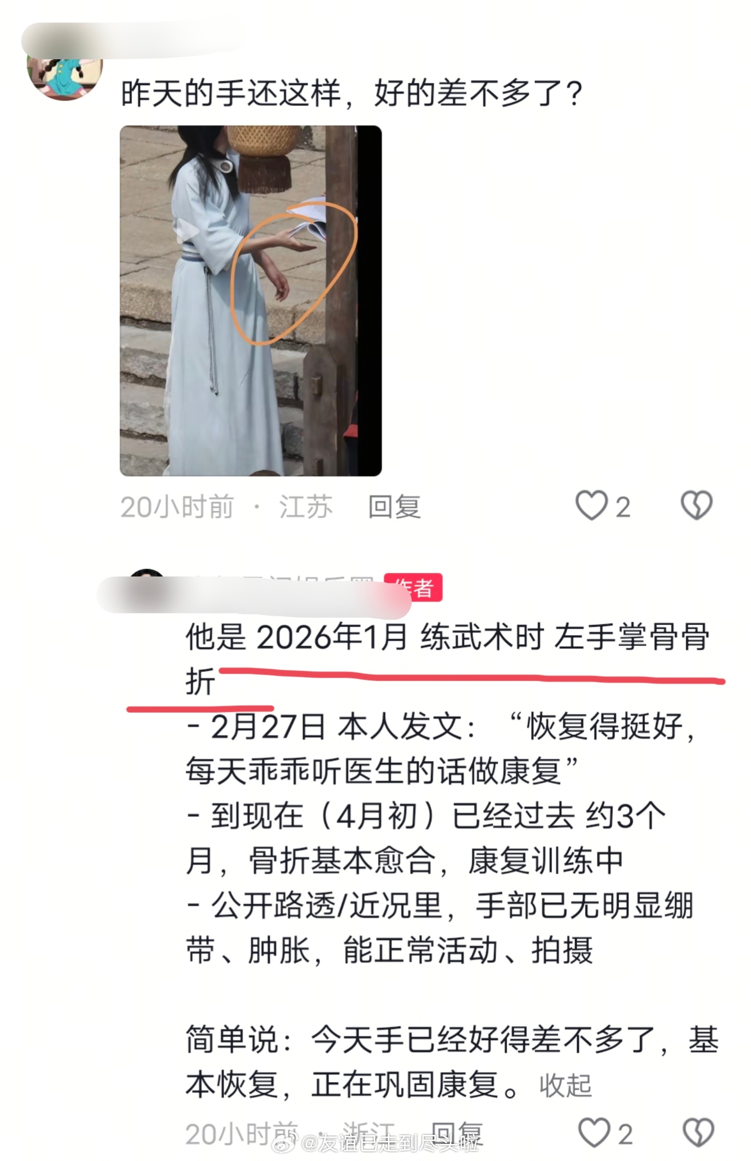 《不让江山》群演爆料杨洋是今年1月武训时骨折,现在已经好的差不多了。
