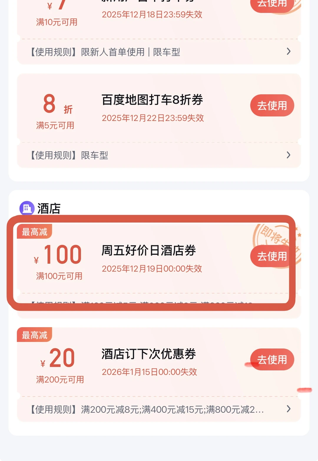 百度地图每周五都会发隐藏的大额酒店券(只有周五才有!!),千万别再原价订了。
