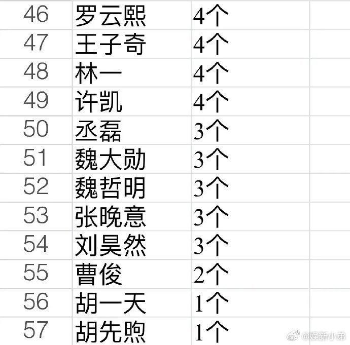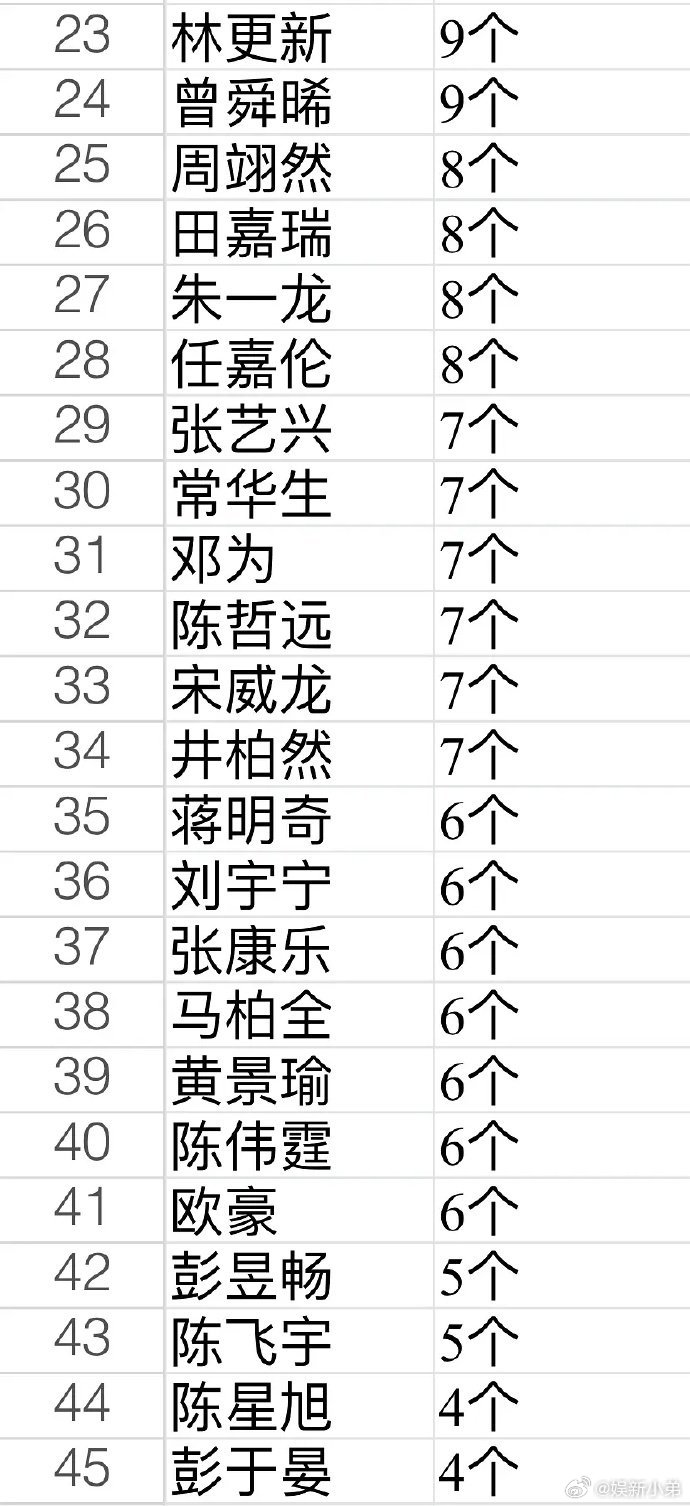 男明星代言统计内娱男明星代言统计:王一博、丁禹兮、肖战、罗云熙、许凯、陈飞宇、檀健次、吴磊、张凌赫、侯明昊、于适、范丞丞、易烊千玺张若昀、王鹤棣、杨洋、王安宇、王俊凯 内娱男明星代言统计