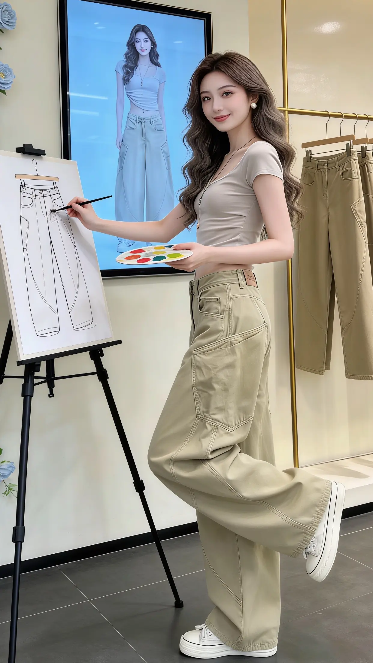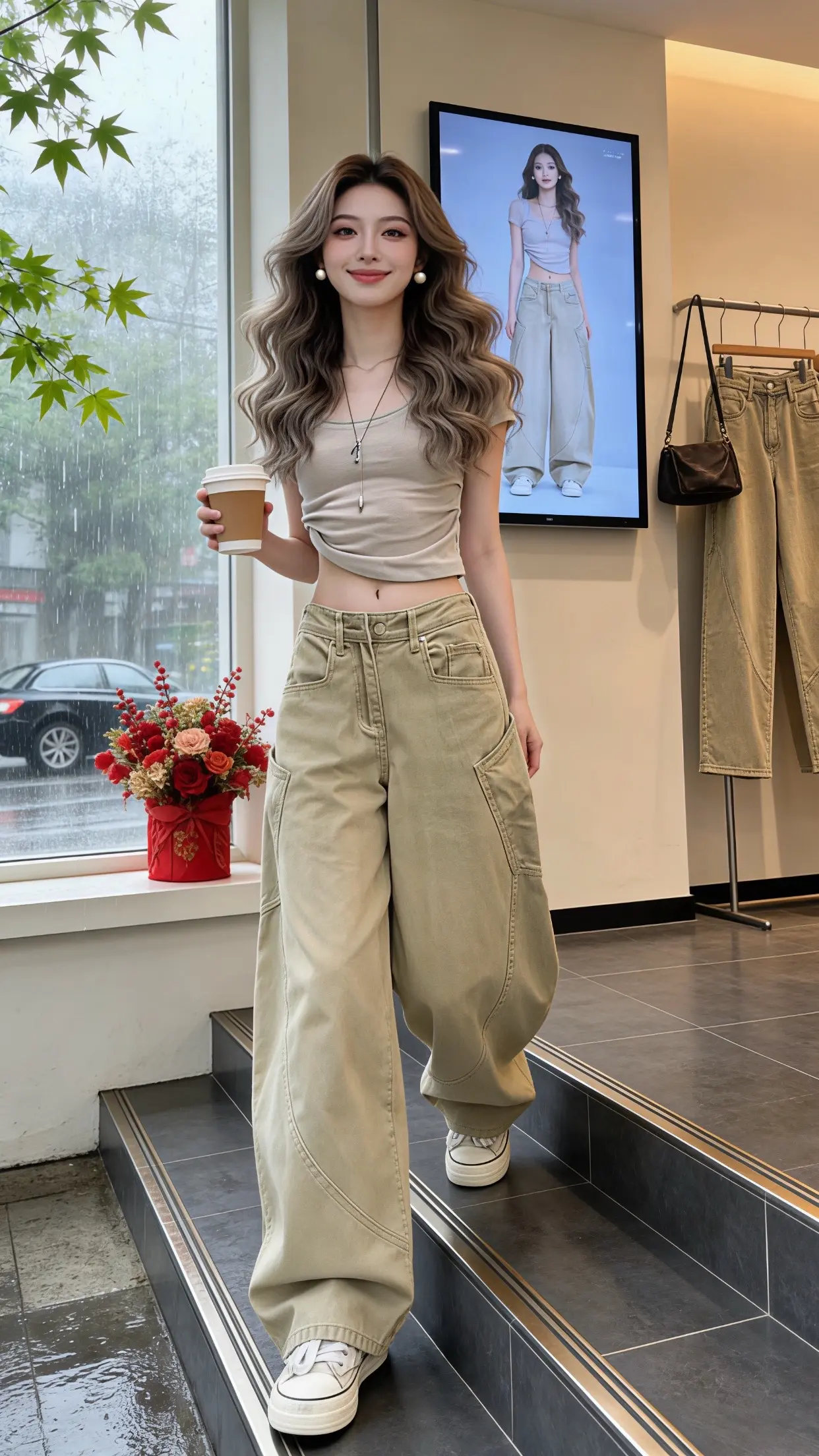 都市少女风,蓝白搭配,时尚穿搭,城市天际线背景,清新自然。