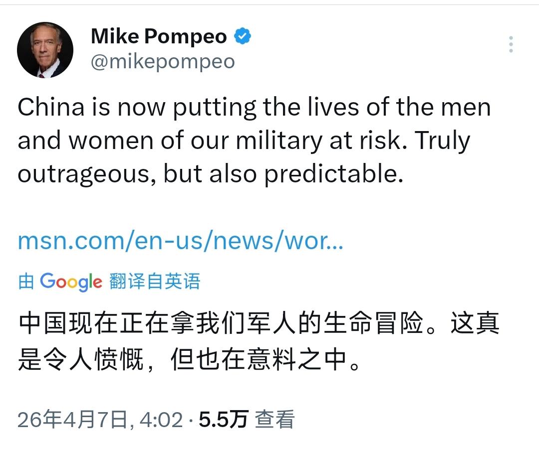 美国前国务卿蓬佩奥今天(北京时间4月7日)发文写道:“中国现在正在拿我们军人的生命冒险。这真是令人愤慨,但也在意料之中。” 【蓬佩奥转发了MSN的新闻,该报道污蔑中国AI私企帮助伊朗定位美军及其设施。】 [机智]评几句:蓬佩奥污蔑中国的言论,是美国霸权式甩锅的典型戏码:美国执意在全球各地派兵驻军,为谋私利肆意搅局中东、挑动地区冲突,把士兵当作霸权扩张的棋子,亲手将他们置于危险境地,如今却倒打一耙,将自身战略失误酿成的危机归咎于中国。毫无实据污蔑中国AI企业帮助伊朗,无视美军侵略才是地区动荡的根源,这番指责尽显虚伪与蛮横。美国部署士兵、制造冲突,最终危害士兵安全的正是美国政府自己,蓬佩奥的指责不过是为掩盖自身罪责、转移国际视线的拙劣表演。