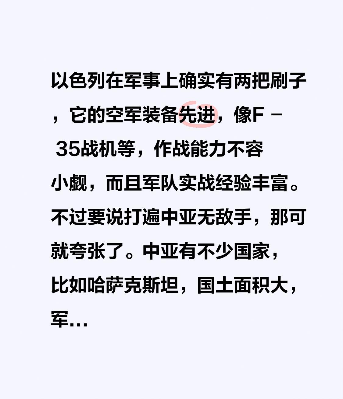以色列在军事上确实有两把刷子,它的空军装备先进,像F - 35战机等,作战能力不容小觑,而且军队实战经验丰富。不过要说打遍中亚无敌手,那可就夸张了。