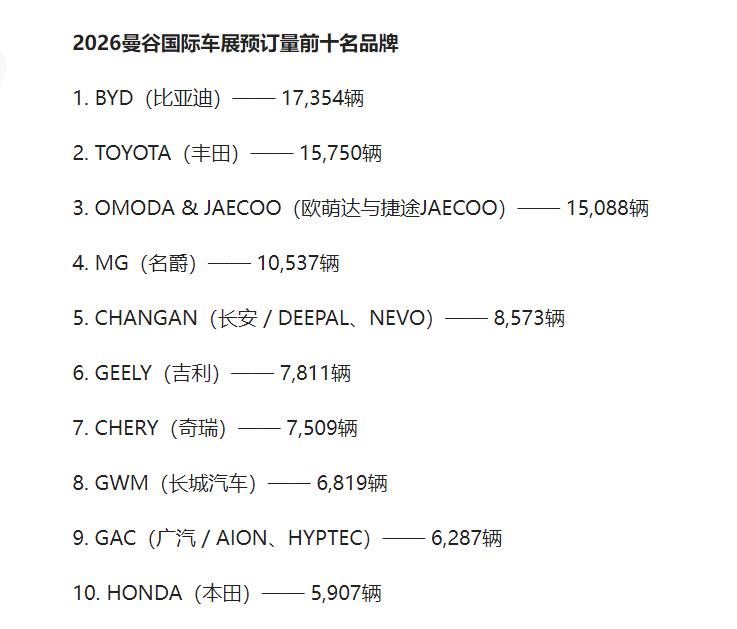 比亚迪力压丰田夺冠,2026曼谷车展中国品牌成最大赢家! 作为泰国最大的车展,第47届曼谷车展已经在4月5日落下帷幕,各大品牌在本届车展的最终订单数据也出来了。 此前因为比亚迪没有公布实时订单数据,而是选择在车展最后一天公布,很多人议论纷纷,比亚迪把惊喜留到了最后,成为本届曼谷车展收获订单数量最多的品牌,力压第二名的丰田而夺冠。 不仅比亚迪,本届车展中国品牌整体发力,订单量前十品牌中,中国品牌占了8位,而此前一直主导该市场的日系品牌中,除了第二位的丰田,就只有排在第十位的本田了。