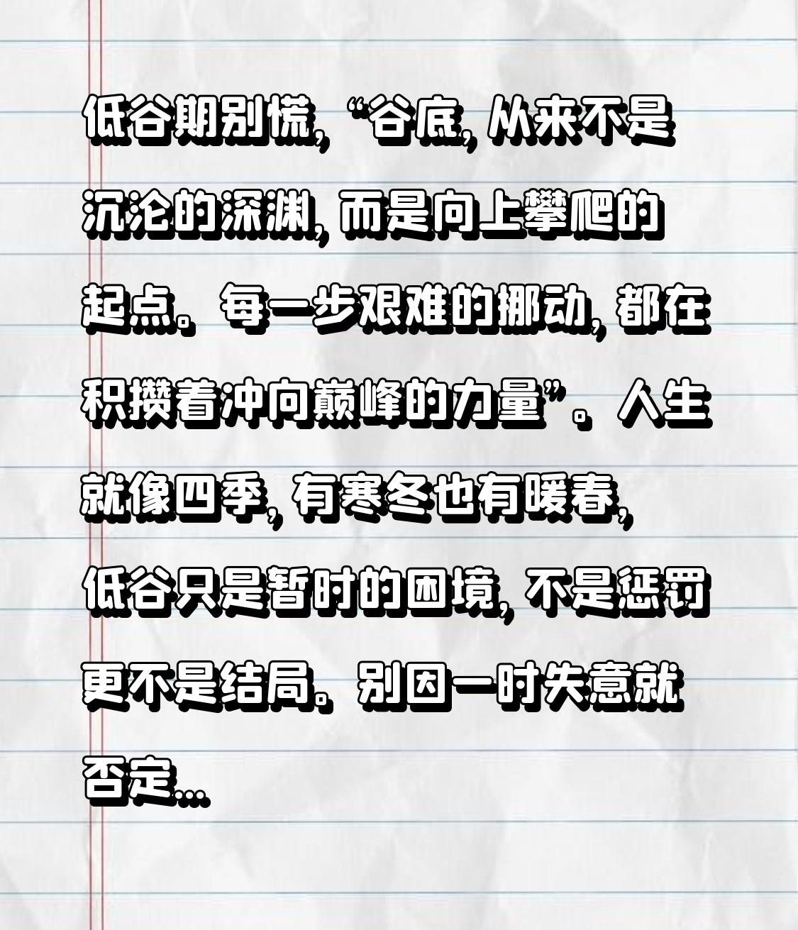 低谷期别慌,“谷底,从来不是沉沦的深渊,而是向上攀爬的起点。每一步艰难的挪动,都在积攒着冲向巅峰的力量”。人生就像四季,有寒冬也有暖春,低谷只是暂时的困境,不是惩罚更不是结局。别因一时失意就否定自己,别人的光鲜背后也有坎坷。低谷期别强行打鸡血,接纳自己的难过、疲惫,放慢脚步也无妨。允许自己暂时落后,认真生活就值得肯定。每一次咬牙坚持,都是在为未来的崛起蓄力,加油!