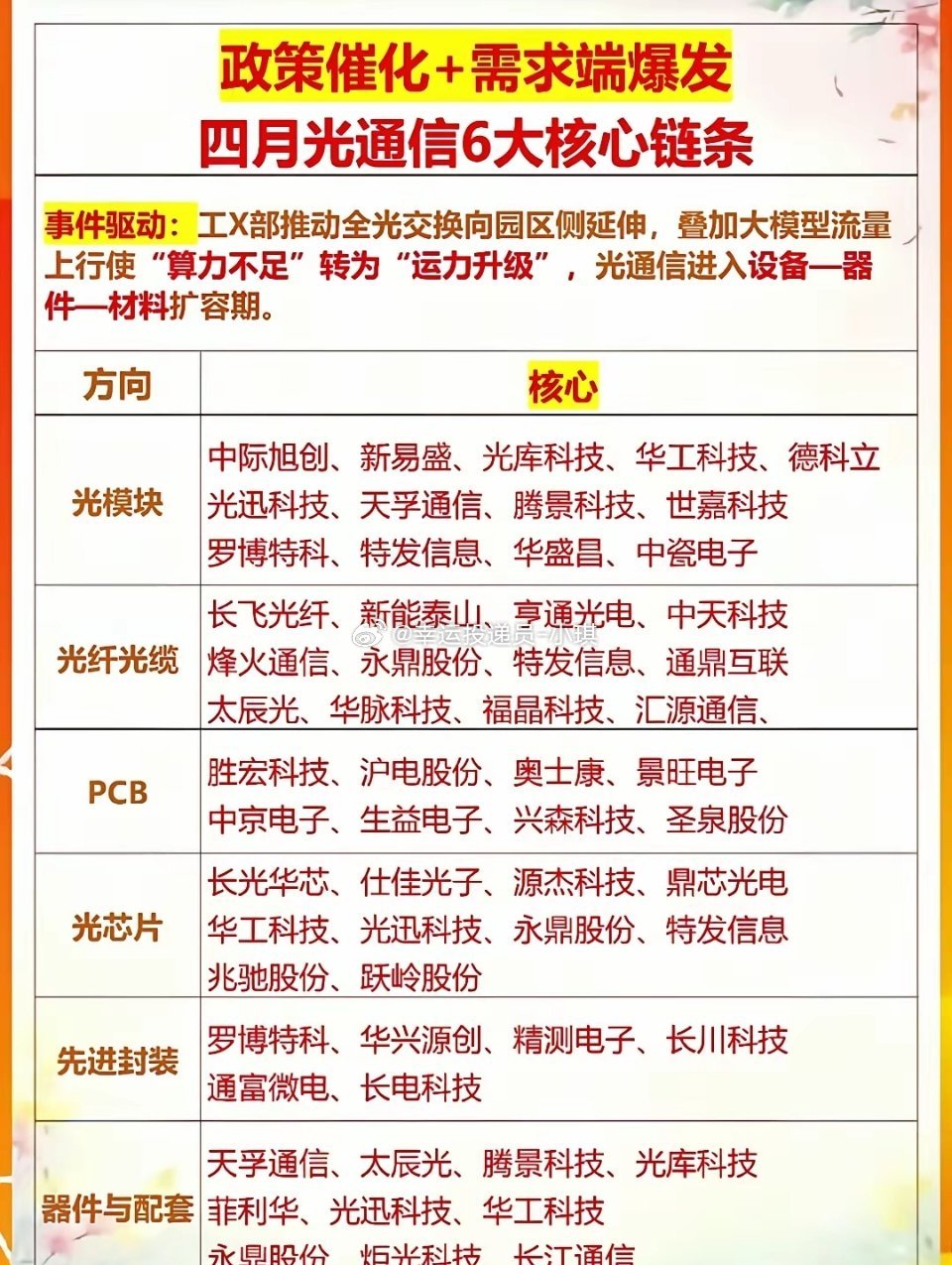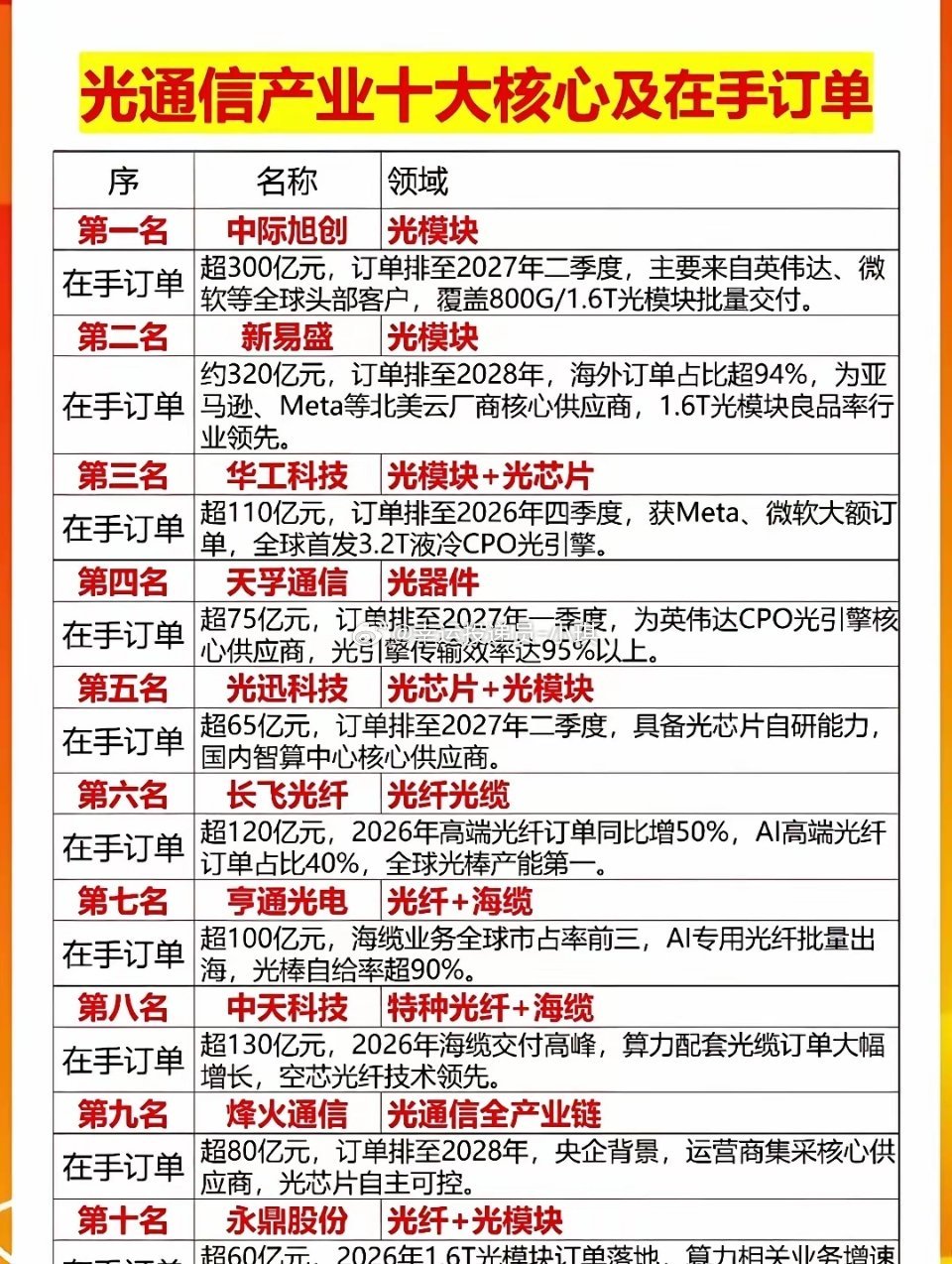 得光者得天下!AI算力时代,光通信全产业链爆发在即,十大行业龙头订单排到2028年!光通信迎来黄金时代!AI大模型流量持续上行,算力缺口倒逼运力全面升级,光通信作为算力网络的“高速公路”,正迎来政策催化+需求爆发的黄金周期,全产业链进入设备、器件、材料的全面扩容期,真正印证了“得光者得天下”的行业逻辑!从核心订单来看,光通信龙头企业早已手握百亿级超级订单,排期最长已至2028年:中际旭创、新易盛超300亿订单锁定英伟达、微软等全球头部客户…长飞光纤、亨通光电、中天科技等光纤光缆龙头,AI高端光纤订单爆满全球光棒产能稳居第一梯队,全产业链景气度拉满。从细分赛道来看,光通信产业链多点开花:✅ 光模块:AI算力核心刚需(中际旭创、新易盛、华工科技)✅ 光纤光缆:算力网络基建核心(长飞光纤、亨通光电、中天科技)✅ CPO/硅光是下一代高速互联核心方案(华工科技、天孚通信、罗博特科)………算力狂飙,运力先行!在AI大模型持续迭代、算力需求指数级增长的背景下,光通信作为算力网络的“生命线”,正迎来历史性发展机遇,全产业链龙头企业将持续受益于行业高景气,真正把握“得光者得天下”的时代红利!⚠️ 风险提示:本文仅为行业科普梳理,不构成任何投资建议,股市有风险,投资需谨慎。