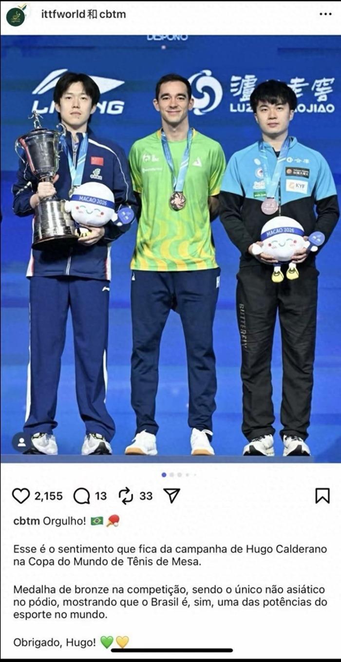 【巴西乒协官媒宣传,看上去似乎雨果才是冠军】巴西乒协官媒在宣传时,真把亚军松岛辉空直接裁掉了,照片里雨果看上去就像冠军。