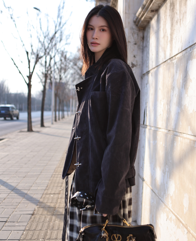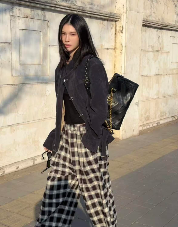 穿麂皮绒夹克+格子裤,时髦又减龄!