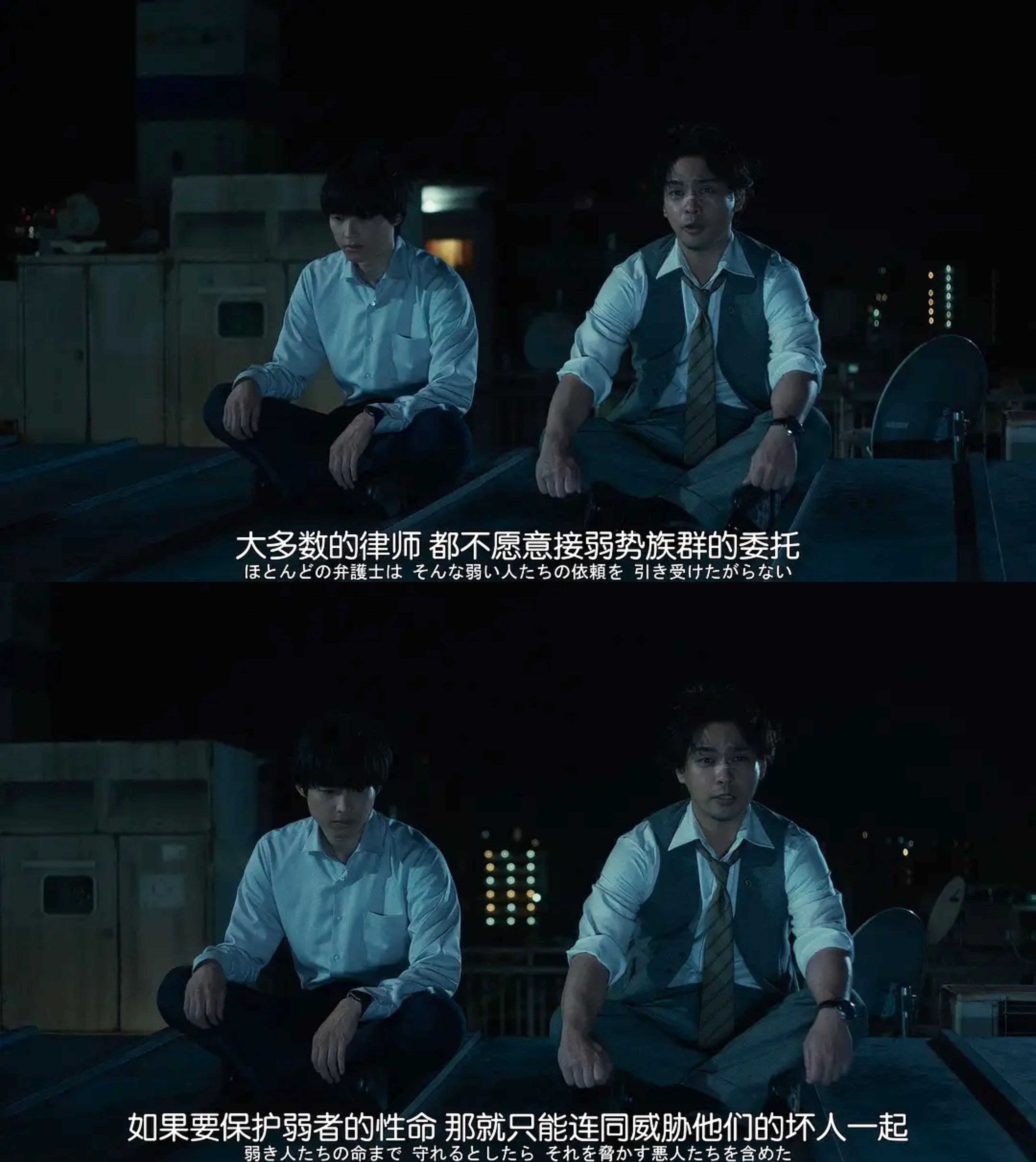 柳乐优弥、町田启太和室毅演得都很夯。柳乐优弥不需要声嘶力竭,仅靠眼神就能传达出对人性幽暗的洞察。而后两位则精准塑造出灰色世界的质感,社会边缘的生存实相。九条的大罪