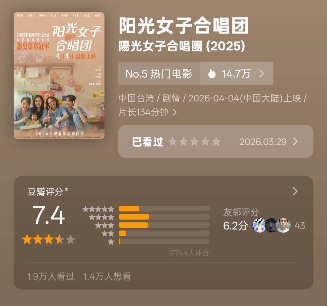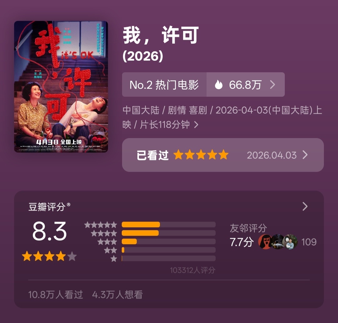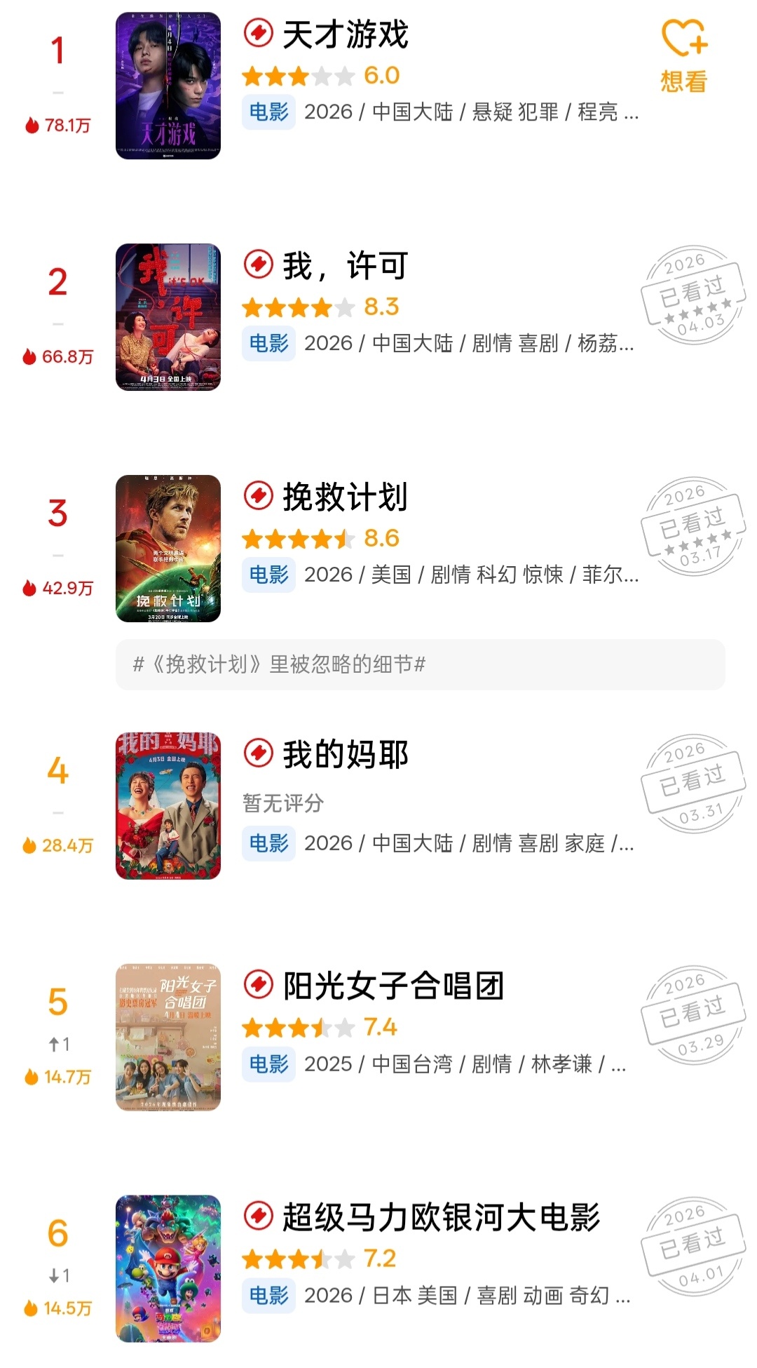 李梦《蝴蝶楼·惊魂》豆瓣开分5.4彭昱畅 丁禹兮《天才游戏》豆瓣开分6.0《超级马力欧银河大电影》开分7.2陈意涵 翁倩玉《阳光女子合唱团》开分7.4文淇 秦海璐《我,许可》开分8.3高司令《挽救计划》涨分至8.6