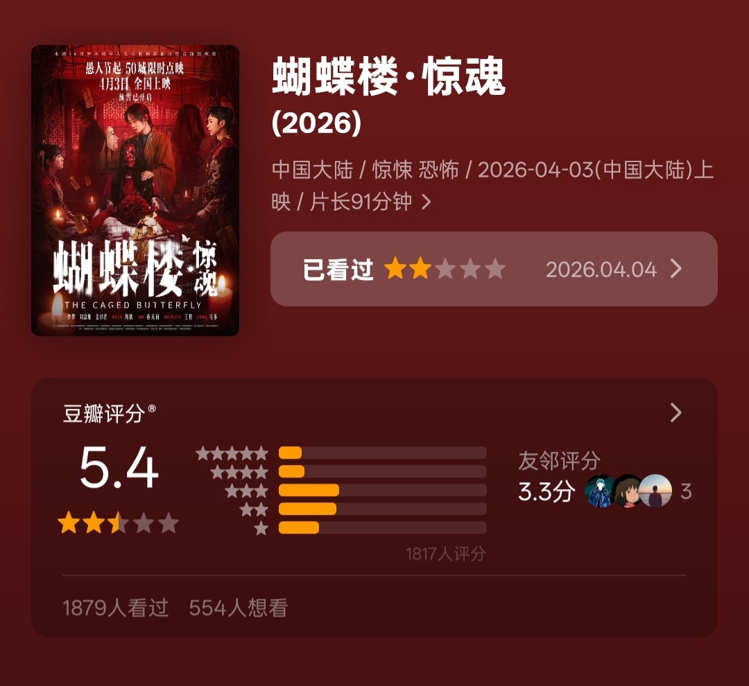 拖了好几天,清明档总算都开分了⬇️李梦《蝴蝶楼·惊魂》豆瓣开分5.4彭昱畅 丁禹