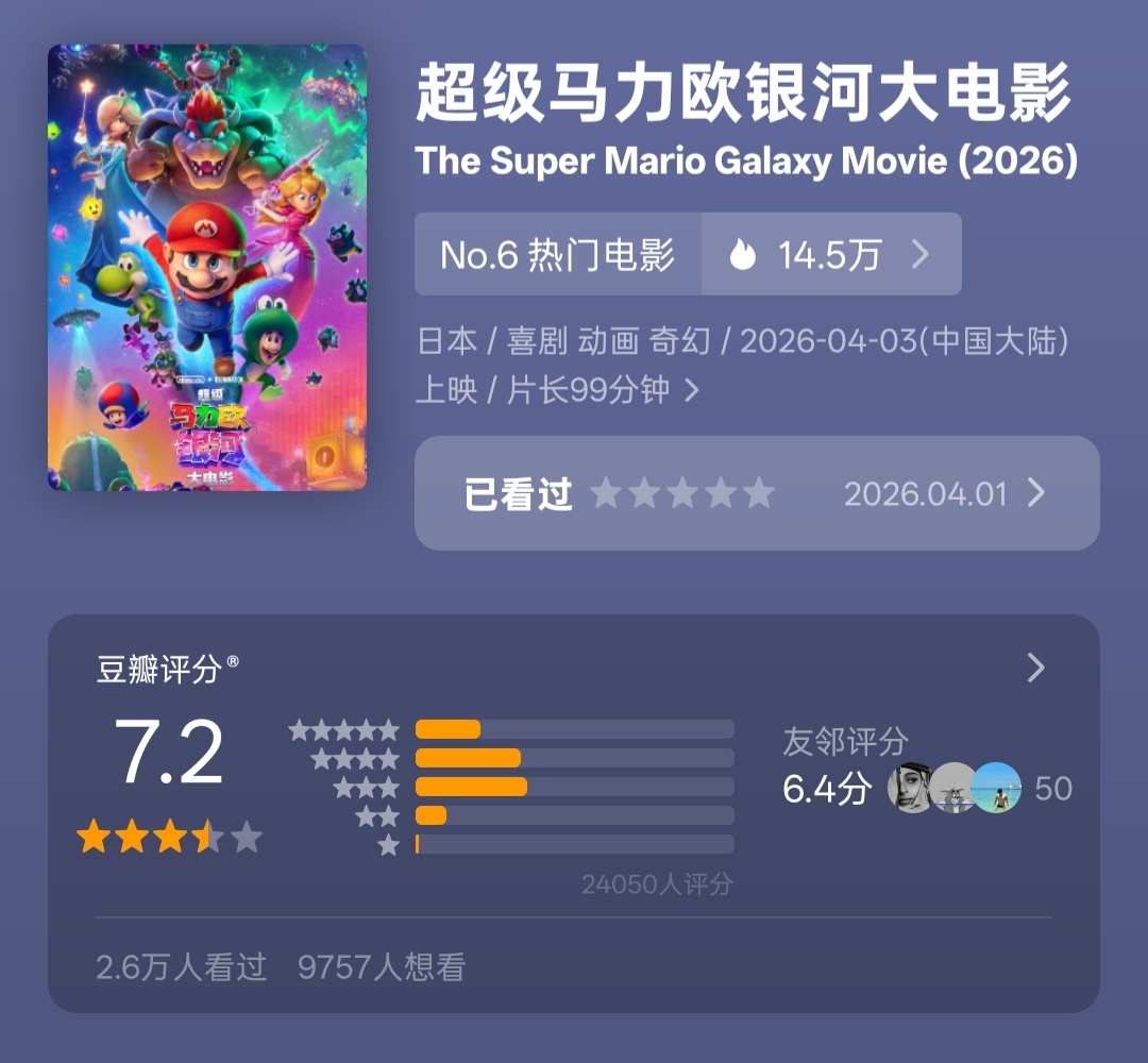 《马力欧》《阳光女子合唱团》这开分是真的很高,如果前两天能正常开的话,估计清明假期还能多卖点,可惜了。天才游戏口碑电影蝴蝶楼惊魂