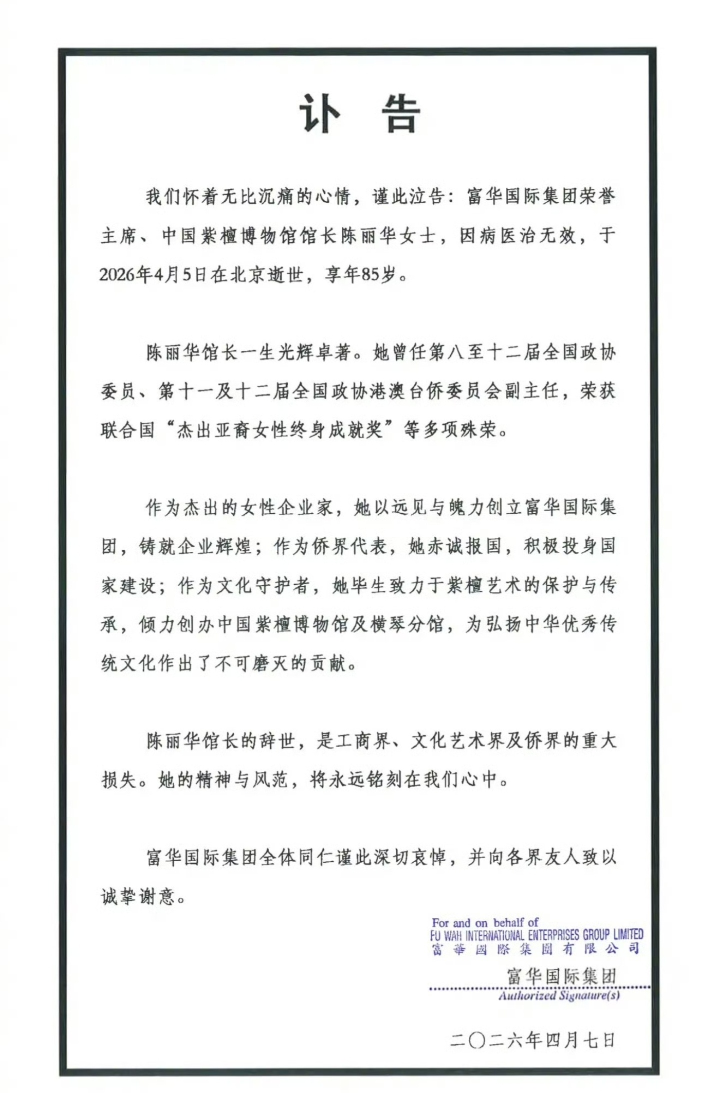 陈丽华身家470亿元真的太唏嘘了!86版《西游记》唐僧扮演者迟重瑞的妻子、传奇女企业家陈丽华女士,永远离开了我们,享年85岁😭4月7日富华国际集团正式发布讣告,确认她于4月5日在北京因病医治无效逝世,一代商界传奇、“紫檀女王”的人生就此落幕,真的让人心里五味杂陈。最让人感慨的是,网传她生前早已安排好遗产分配,坐拥数百亿身家的她,给四个孩子各分百亿资产,剩下的所有财产,全都留给了相伴36年的丈夫迟重瑞,保守估计也有200亿,用半生相伴和真心,击碎了当年所有的流言蜚语。她晚年极少公开露面,最后一次现身是2025年3月的联合国妇女地位委员会相关论坛,当时还获颁了杰出女性终身成就奖,画面里精神状态尚好,谁能想到短短一年就传来噩耗。愿陈丽华女士一路走好,传奇永不落幕。