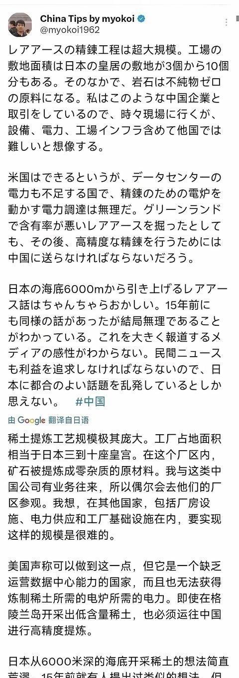 一个亲自参观过我国稀土提炼工厂的日本人在社交平台发文,竟然毫不客气地指出,无论是日本还是美国,都几乎不可能建造出一套成熟的稀土提炼工艺,至于日本媒体所声称的从6000米海底开采稀土的想法,更是荒谬至极。 2026年初,松本得到一次技术交流机会,前往中国赣州地区的稀土分离车间。这次参观让他直接接触到大规模生产的实际运行情况。他提前准备好防护装备,跟着引导人员走过厂区,观察到车间里的温度控制、液体处理和设备操作细节。这些现场所见,让他对两国在稀土提炼能力上的差异有了更具体的认识。松本的职业路径一直围绕材料工程的具体技术评估,没有转向管理岗位或公开宣传。他通过多年现场工作积累经验,直至职业后期仍专注处理工程里的实际环节。 1月17日那天,松本在社交平台发了条推文,配上他在赣州工厂拍的高清照片。照片里能看到萃取槽排列整齐,废水处理池的水质清晰。他在文字里直接说,日本和美国在现有条件下很难独立建成一套成熟的稀土提炼系统,日本媒体反复提到的从6000米海底开采稀土泥的想法,在工程实际中面临根本困难。这话说得不留情面,却基于他亲眼看到的工厂运行状态。 参观过程中,他注意到车间环境温度稳定控制在特定数值,搅拌设备转速保持精确。值班人员通过观察液体界面就能快速调整加料操作,后续化验数据证实这种判断的准确性。松本把这些和自己以前在日本参与的试验对比。那次日本国家级稀土提炼试验里,温度只小幅波动,就导致整批高纯度材料报废,资金损失明显。他在推文中提到这些实际案例,指出参数精确控制和工人长期积累的判断能力,不是短期投资设备就能补上的。 美国加州芒廷帕斯矿的情况也被他拿来举例。这个矿有大量储量,但开采出的矿石长期需要运到中国进行加工,再以成品形式买回。这种依赖暴露了加工环节的实际短板。日本方面,深海采矿计划围绕南鸟岛周边海域展开。媒体曾报道那里有丰富稀土泥,声称能为日本提供长期供应。但松本指出,当前深海设备作业极限深度在4100米左右,要到6000米,需要面对每平方厘米约60个大气压的压力,设备研发和维护成本远高于陆地项目。即使把淤泥捞上来,杂质成分复杂,处理难度至少是陆地矿的数倍,而全球成熟的分离产能主要集中在少数地区,缺少下游加工能力就无法形成完整链条。 现实中,日本在2026年2月确实用“地球号”钻探船在南鸟岛附近约5700-6000米深度成功取回含稀土的沉积物样本,被称为世界首次在这种深度进行的测试回收。这项测试由日本海洋地球科学技术机构主导,目的是减少对外部供应的依赖。但从商业角度看,捞上来的泥杂质多,处理成本高,在没有成熟分离能力的情况下,难以形成经济闭环。类似情况在美国也存在,芒廷帕斯矿虽然在2025年左右扩大生产,目标供应全球一定比例的稀土矿产,但重稀土加工等关键环节仍面临挑战,部分产能建设需要时间。 松本的推文把这些工业逻辑摆出来。他提到,中国工厂在废水处理等方面的运行状态,和一些海外对“高污染”的印象有出入。这不是宣传,而是现场观察到的处理设施实际表现。全球稀土供应链里,中国在分离和提炼环节占据主导地位,占到加工能力的绝大部分比例。这种格局不是一天形成的,而是通过长期规模化生产和参数优化积累起来的。日本和美国试图通过补贴或国际合作来重建链条,比如美日之间在2026年3月左右的行动计划,重点放在部分矿产的价格底线和供应链合作上,但实际推进中,时间成本和资金投入都很大。 深海采矿的工程难度不止于下潜压力。管线系统要承受极端环境,回收效率、设备耐久性和后续运输处理都是现实问题。日本的测试虽然取得样本,但从测试到商业化还有很长距离,成本估算显示深海提取、运输和精炼的总费用可能远高于当前市场水平。松本在推文中强调,即便不计成本把泥从海底弄上来,如果没有地方处理,商业逻辑上就难以持续。这和陆地矿的情况类似:有矿不等于有完整的加工体系。 G7国家曾讨论稀土联盟之类的安排,澳大利亚有矿但加工技术有限,欧洲一些国家有需求却在投资意愿上存在分歧。实际结果是联盟在利益面前难以形成合力。美国作为资源大国,却在加工环节依赖外部,这种角色让供应链显得脆弱。松本的观察不是孤立的,日本企业长期以来也在评估中国出口政策变化对自身的影响,2026年初就有报道提到日本公司还在观察相关限制的实际效果。 松本健一的推文发布后,在日本社交网络上传播开来。技术圈有人转发讨论现场参数和本国项目的差距,媒体平台上出现分析工业能力的帖子,也有一些声音觉得他的表述太直接。松本本人没有卷入更多公开争论,他继续自己的技术咨询工作,在小型内部交流时提到参观时看到的设备布局和操作流程,强调工艺参数需要长期投入,不是单纯靠资金或设备就能快速实现的。他的话没有引发大规模争议,更多是让部分人重新看清工业积累的实际含义。