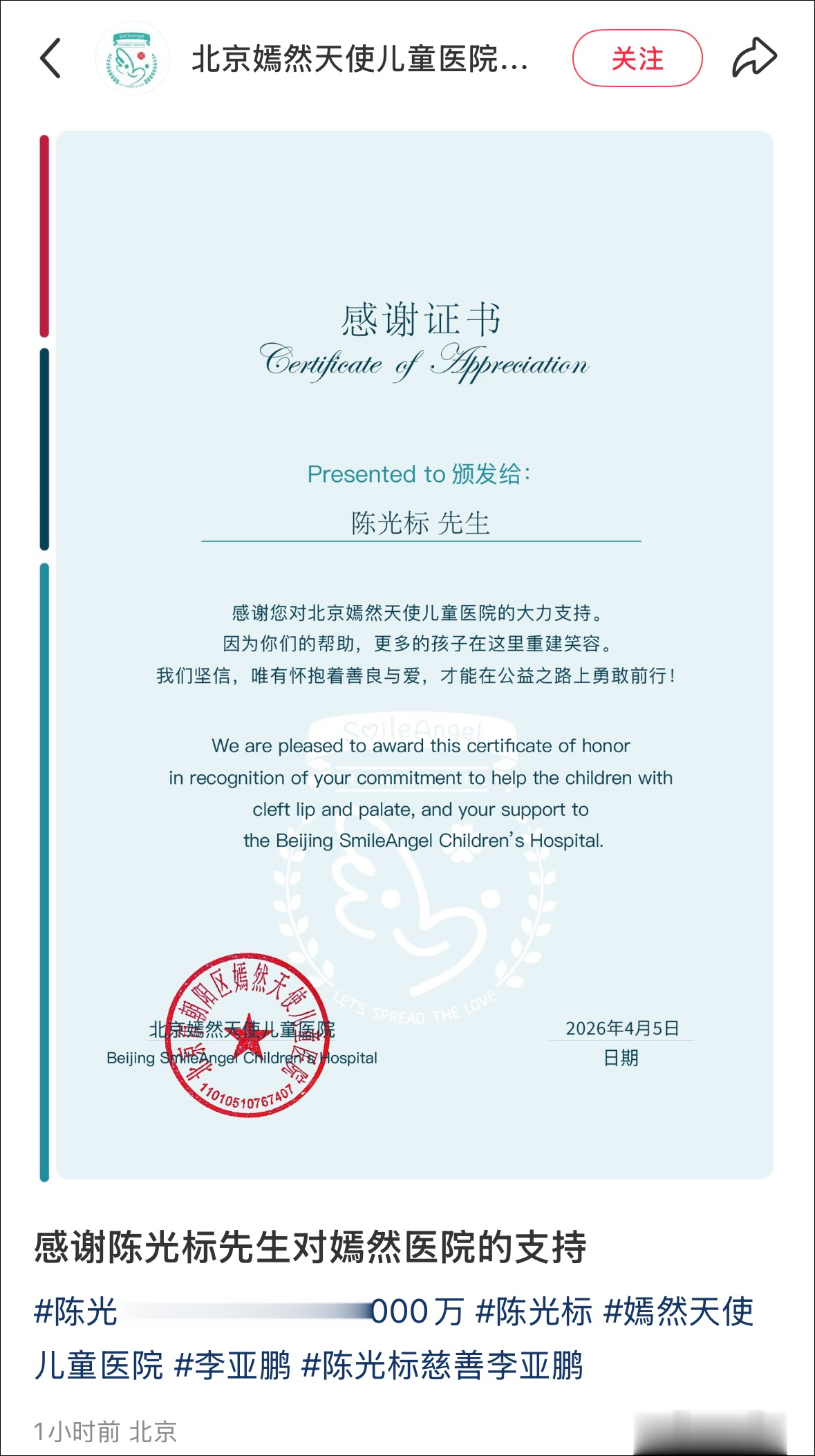 4月7日,“北京嫣然天使儿童医院体检中心”官方账号发布颁发给陈光标的感谢证书。