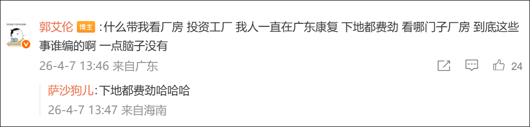 此外,他还在评论区称,“什么带我看厂房、投资厂房,我人一直在广东康复,下地都费劲,看哪门子厂房”。