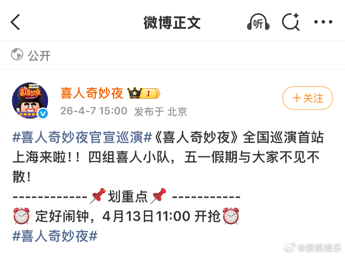 喜人奇妙夜巡演首站官宣 今日官宣全国巡演首站—上海!五一假期直接被喜人承包了!