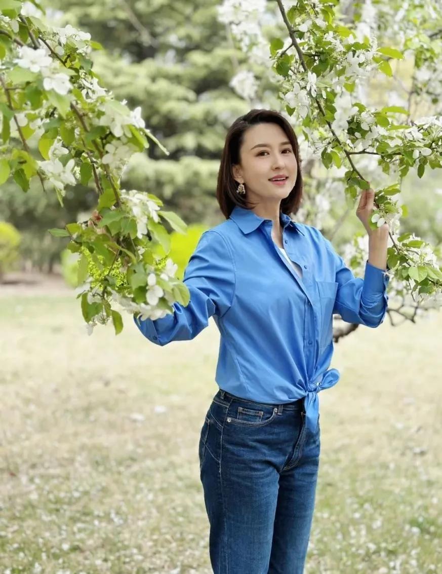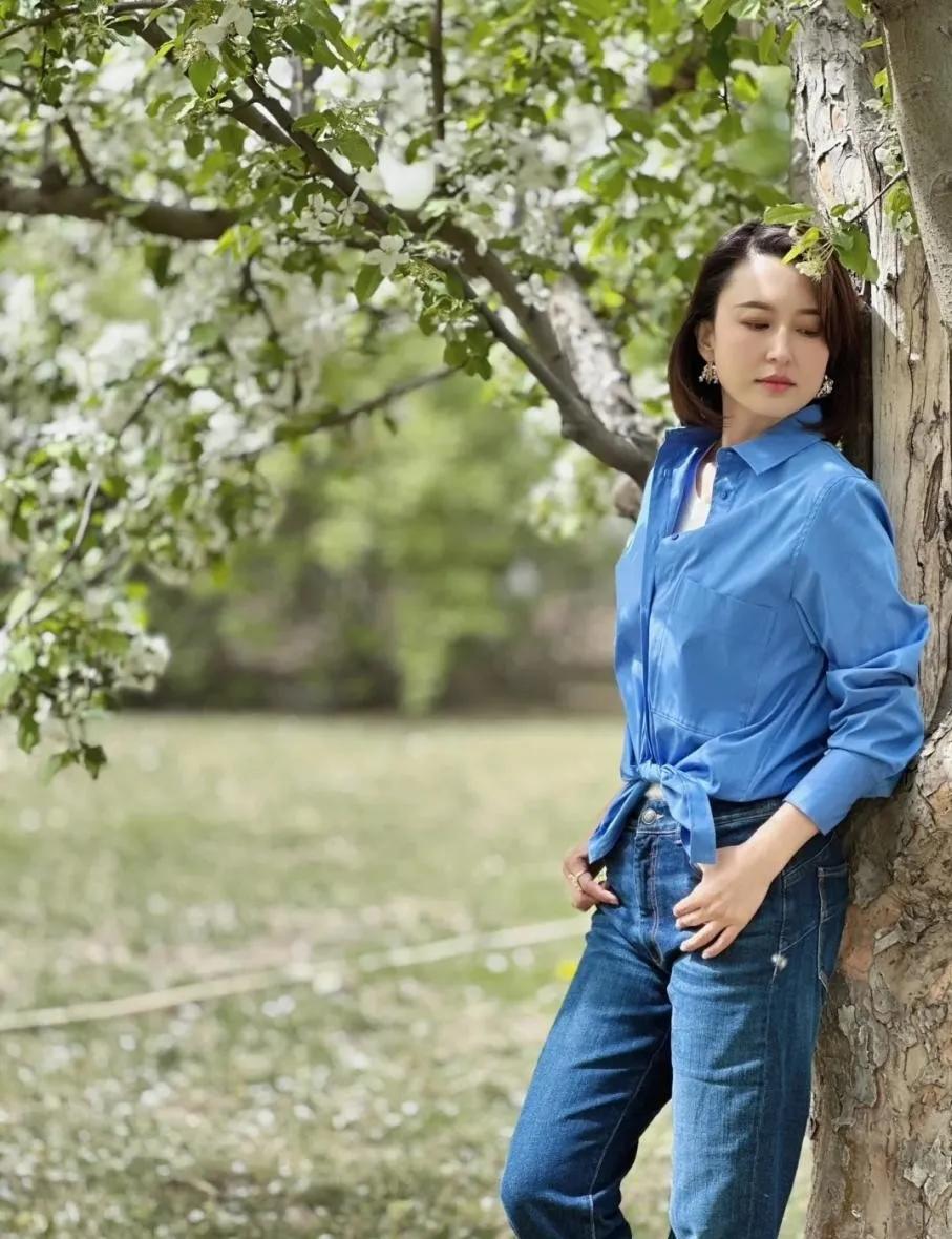 张蕾这穿搭真的太适合中年姐妹抄作业了! 一件宝蓝色衬衫,下摆打个结,瞬间拉高腰线显腿长,内搭白T清爽不沉闷。 配一条经典牛仔裤,休闲又时髦,减龄又高级,完全没有大妈感! 春天出游这么穿,拍照巨上镜,舒服又好看! 张蕾 张蕾穿搭 中年女性穿搭 蓝衬衫 牛仔裤 春日穿搭