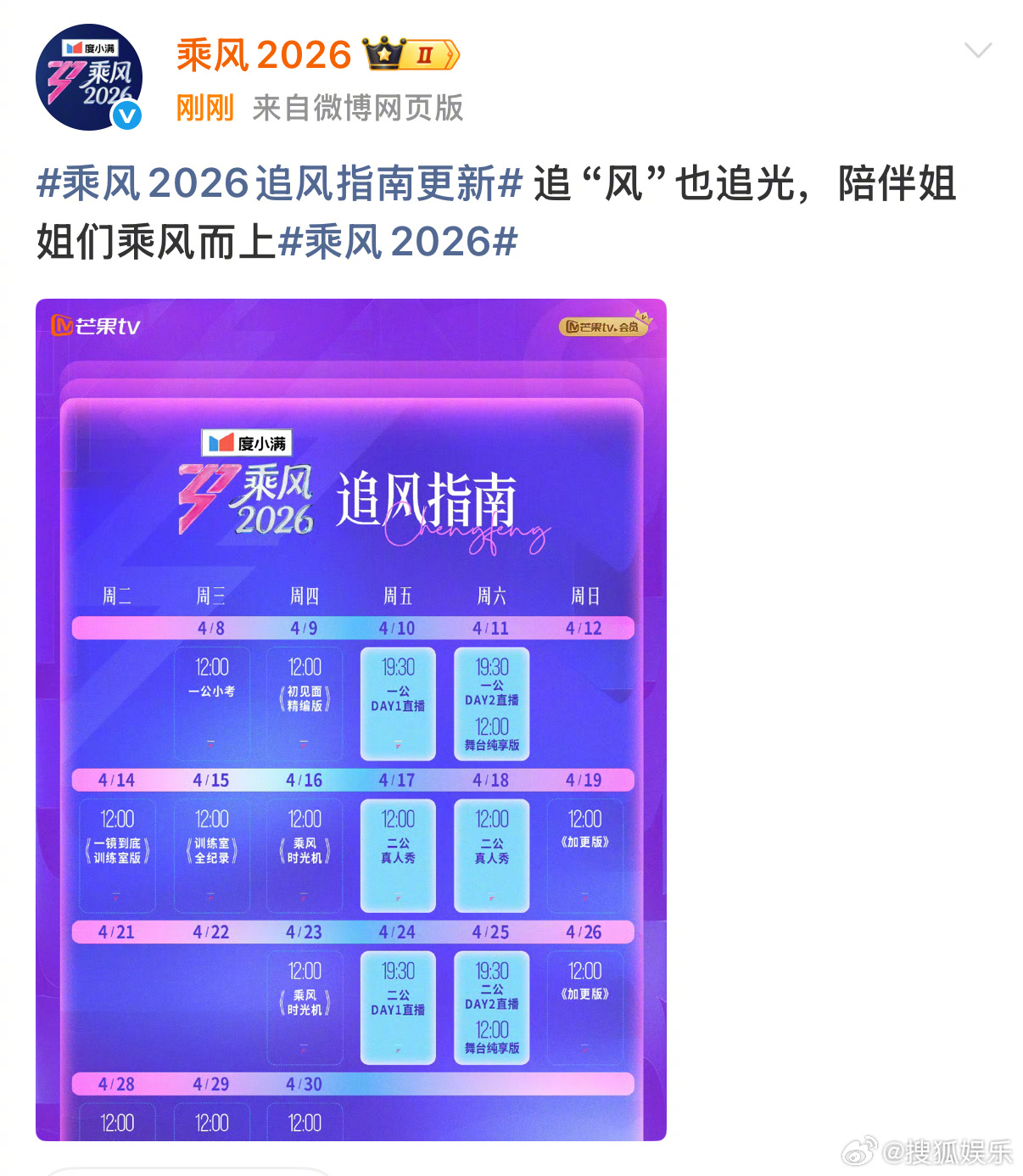 浪姐一公小考取消直播 发布最新版“乘风指南”,除了公演外,其他环节都取消直播,快来查收最新版追综日历吧~ 乘风2026