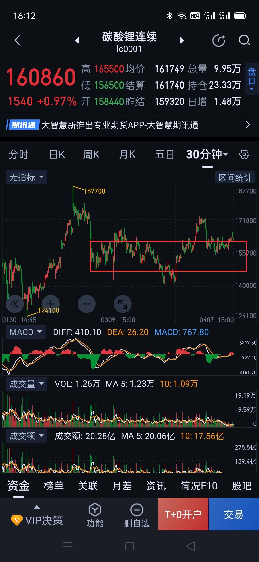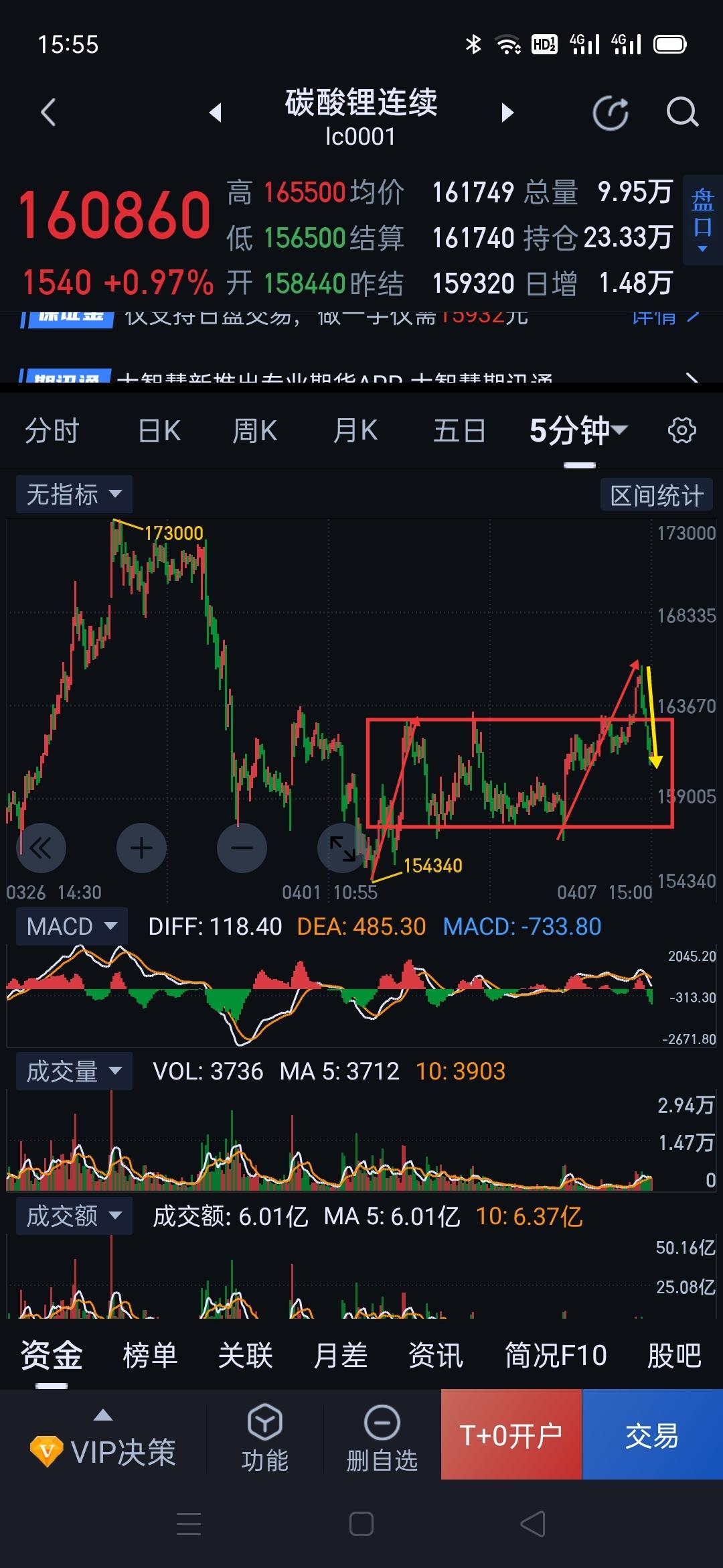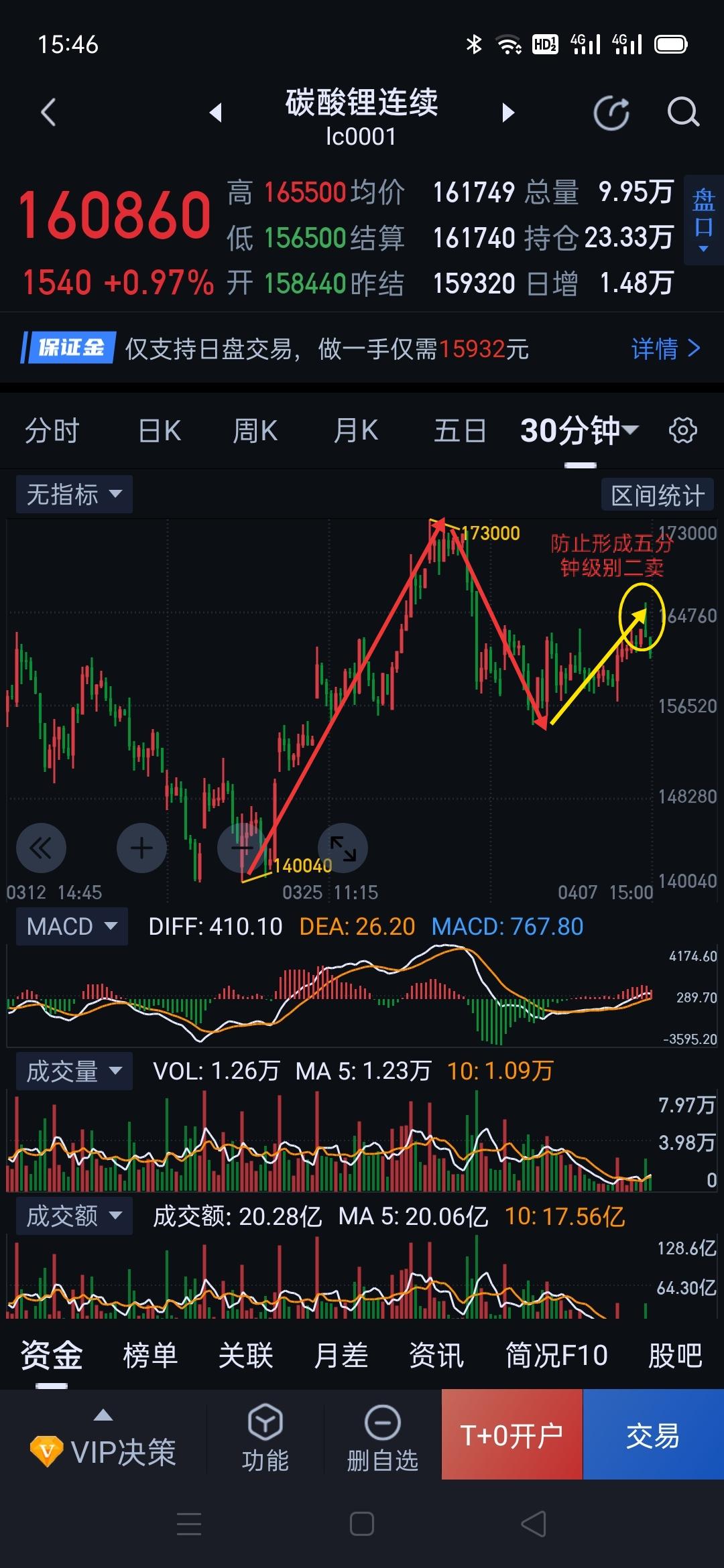 碳酸锂,明天面临变盘时间窗口。 碳酸锂,今天虽然守住了图(1)多空分界线,但走势冲高回落,多少有些虎头蛇尾。在次级别图(2),一分钟级别盘整背驰后,尾盘重新回到图(2)中枢内。显示碳酸锂短期做多意愿松动。要防止在173000下方遇阻,形成图(3)五分钟级别二卖。 明天,盘中仍需观察图(1) 多空分界线附近的争夺。守住,用移动止盈保护利润,暂用多头思维跟随走势生长。如果多空分界线破坏,将回归空头主场,要防止空头借势发力破坏图(4)中枢 。