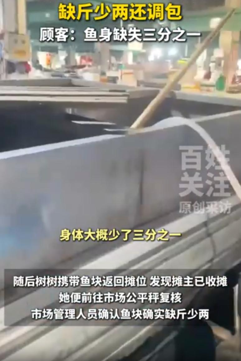 浙江慈溪,女子去菜市场买了一条鱼,可到家后就觉得哪里不对劲,于是较真一下,把鱼身给拼接在一起,这才发现不仅缺斤少两,甚至还被掉了包。网友:这是把人当傻子啊 女子介绍,前两天去周巷菜市场,在一个摊位上买了一条花鲢鱼,也就是大家常说的胖头鱼。摊主麻利地给她切块、装袋,她付了钱拎着鱼就回家了。 到家之后,她准备清洗鱼块下锅。可洗着洗着,她就觉得哪里不对劲。这鱼块,怎么看怎么别扭 她也没多想,干脆把鱼块一块一块地在案板上拼了起来。这不拼不要紧,一拼,问题全出来了 整条鱼拼完之后,中间明显缺了一大截。她数了数,鱼身大概少了三分之一。更让她窝火的是,这鱼块上的肉,切法、厚度、纹路,跟前半截对不上号,这根本不是同一条鱼身上的 她买的是大花鲢,回家拼出来的,不知道是哪条鱼拼凑出来的杂牌军 这位女士没忍气吞声,拎着鱼就回了菜市场。结果到了摊位一看,摊主已经收摊走人了。她转头去了市场的公平秤,让管理人员帮忙复核。管理人员一看,确实缺斤少两,也承认鱼块有问题,表示可以帮忙协调解决 但她拒绝了。不是她不给面子,而是她觉得这种事已经不是第一次了,靠私下解决,解决不了根本问题。她直接向市场监督管理局投诉,把手里的证据、摊位的具体信息一并交了上去。目前,投诉正在处理当中 有网友调侃:老板没想到顾客回去洗会拼图 虽然是个玩笑话,但想想还真是这样,很多人买菜,回家洗洗切切就下锅了,谁会想到把鱼块再拼回去看看?要不是这位女士多留了个心眼,这条鱼的真相,就被一顿饭盖过去了 而女子她没有当场大吵大闹,也没有忍气吞声就算了。她选择了最直接、最有效的方式:保留证据,走正规渠道投诉。公平秤复核、拍照留底、向市监局投诉,每一步都走得清楚明白。这其实很有必要