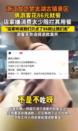 浙江湖州,一位游客在太湖古镇逛累了,随便找了家餐馆坐下,点了86块钱的菜。还没等动筷子,店员就板着脸过来了:“点这么少,才86块,我们不做。”硬生生把人往外赶。游客愣住了,明码标价的店,吃饭还要看钱多钱少?最后只能退款走人,心里堵得慌。视频传到网上,网友炸了锅:“86块不是钱?”事情闹大后,景区和商家都采取了措施。   (信源:凤凰网---太湖古镇事件:两位游客消费86元,怎么就不能吃了?)   清明小长假前夕,湖州太湖龙之梦度假区里正是热闹的时候,不少游客趁着好天气,来这里逛古镇、吹湖风,享受难得的休闲时光。   有一对游客逛得腿都软了,看着路边一家餐馆就直接走了进去、   没多想,就按着两个人的食量点了几个菜,结账的时候才知道一共86块钱,付完钱找好座位坐下,就等着上菜歇口气。   谁也没想到,菜还没影子,店里的店员就走了过来,脸拉得老长,语气硬邦邦的,直接浇了游客一盆冷水:点这么少,才86块,我们不做。   说着就伸手要把两个人往外赶,那态度,没有一点做生意的客气,反倒像是游客做错了什么大事一样。   游客当时就愣住了,一时没反应过来。   他们明明是按着店里的菜单明码标价点的菜,没少付钱,也没挑三拣四,怎么就因为消费少,就被拒绝服务了?   更何况当时店里还有不少空位,他们点的也都是简单的家常菜,几分钟就能做好,根本不费什么功夫。   游客试着跟店员理论了几句,问为什么明码标价的店,吃饭还要看消费多少,可店员根本不搭理,态度依旧强硬,就是不肯给他们上菜。   最后没办法,游客也不想闹得太难看,更不想影响接下来的行程,只能无奈申请退款,带着一肚子的委屈和郁闷离开了这家餐馆。   本来好好的游玩心情,全被这突如其来的拒单给搅乱了,换谁都会觉得心里堵得慌,好好的一顿饭,没吃成不说,还受了一肚子气。   回去之后,越想越不舒服,游客就把当时的情况拍了视频发到了网上,本来也只是想吐槽一下,没想到视频一发出去,立马就火了,网友们直接炸了锅。   大家纷纷留言吐槽,86块钱怎么就不是钱了?开门做生意,讲究的就是童叟无欺,哪有嫌客人消费少就拒之门外的道理?   还有网友说,自己去景区吃饭,有时候也会点不多,要是都这样,那普通游客还敢随便进店吗?   随着网友的热议,这件事也越闹越大,很快就被景区方面注意到了。   毕竟太湖龙之梦度假区也是当地有名的旅游景点,出现这样的事情,不仅影响游客的体验,更会砸了景区的招牌。   景区第一时间就展开了调查,确认了涉事餐馆确实存在违规拒客、变相设置最低消费的行为,没多久就给出了处理结果。   景区不仅责令涉事餐馆立即停业整改,还第一时间联系上了当时被拒单的游客,诚恳地向他们道歉,好在游客也比较通情达理,接受了景区的道歉。   除此之外,景区还公开表示,会全面加强园区里所有餐饮商户的管理,开展专项整治,杜绝这种嫌贫爱富、拒绝服务的情况再次发生,全力保障游客的合法消费权益。   其实这件事说大不大,说小不小,86块钱不多,但背后反映的却是商家的经营态度和景区的管理漏洞。   开门做生意,从来都不是只做高消费客人的生意,普通游客的消费同样值得被尊重。   客人来消费,买的不仅是一顿饭,更是一份舒心的体验,嫌客人消费少就拒之门外,看似是赚了眼前的小便宜,实则是砸了自己的招牌,丢了长远的生意。   对于景区来说,商户的经营行为直接关系到景区的口碑,一句生硬的拒绝,可能就会让游客对整个景区失去好感,甚至再也不来。   旅游行业的长久发展,靠的从来不是宰客式经营,而是真诚的服务和规范的管理。   这件事也给所有景区和餐饮商户提了个醒,诚信经营才是立身之本,尊重每一位消费者,用心做好服务,才能留住客人,才能走得更远。   毕竟,不管消费多少,每一位客人都值得被善待,这才是做生意最基本的底线。