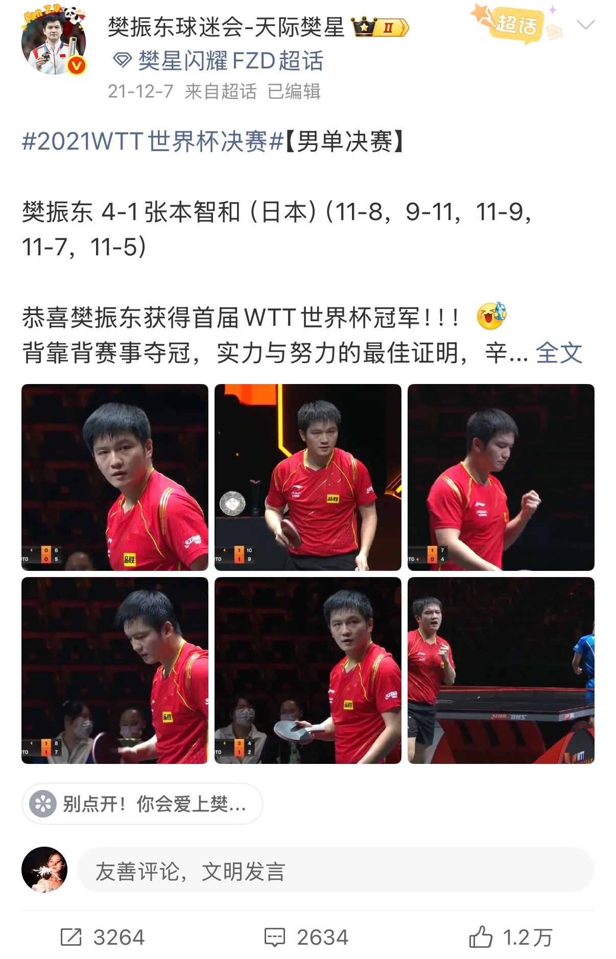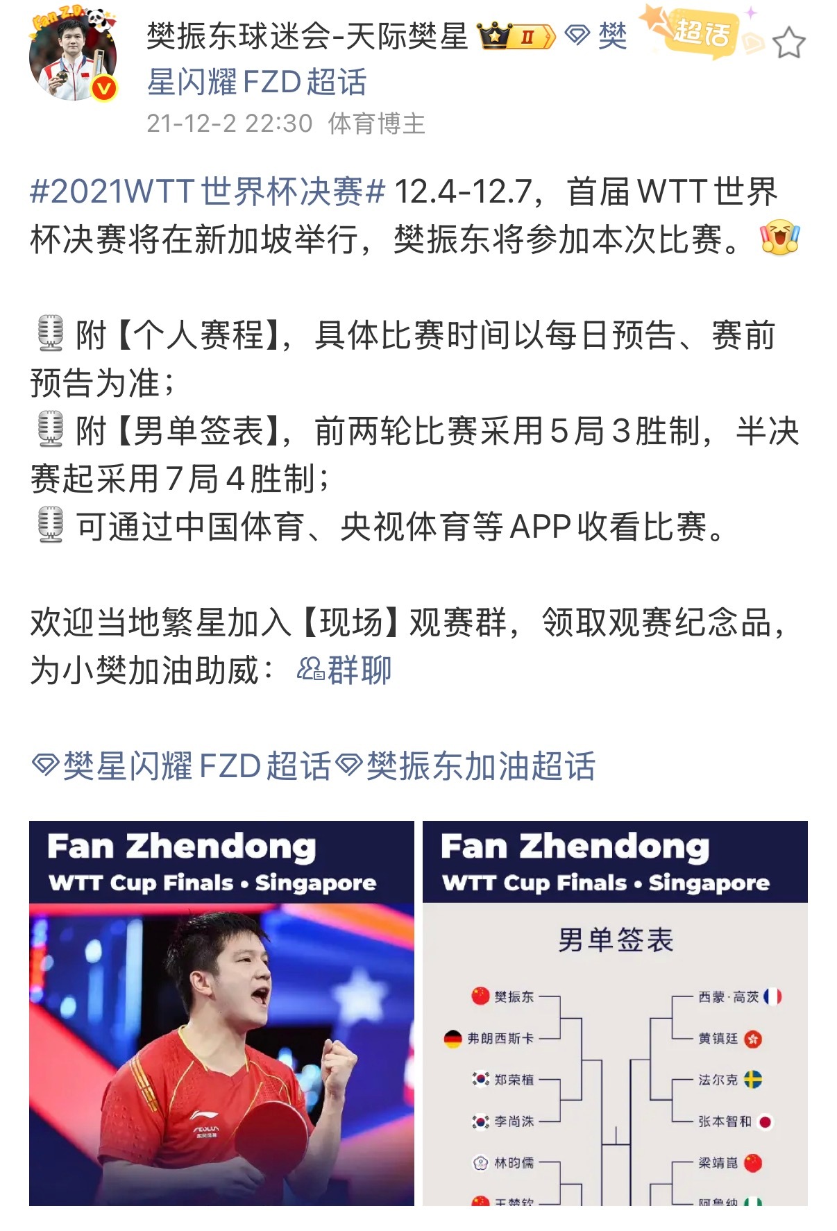 补档旧闻:WTT总决赛(英文 WTT Cup Finals)成立之初想蹭世界杯的名头,起了个中文特供翻译WTT世界杯总决赛(现在又被发配回WTT总决赛),第一届在新加坡举办,当时刚休斯顿世乒赛夺冠的樊振东无缝参赛,实力依旧,一周之内拿下双冠,先后击败弗朗西斯卡,郑荣植,王楚钦(樊振东一周之内完成双赢),张本智和,成为该赛事的首位冠军得主。是总决赛就是总决赛,是世界杯就是世界杯,WTT的前缀就已经证明它不可能顶替真正的世界杯,我还是今天知道,决定一项比赛性质的是地方体育局樊振东23岁成就世界杯四冠王