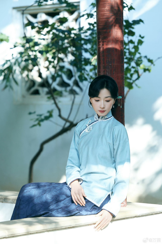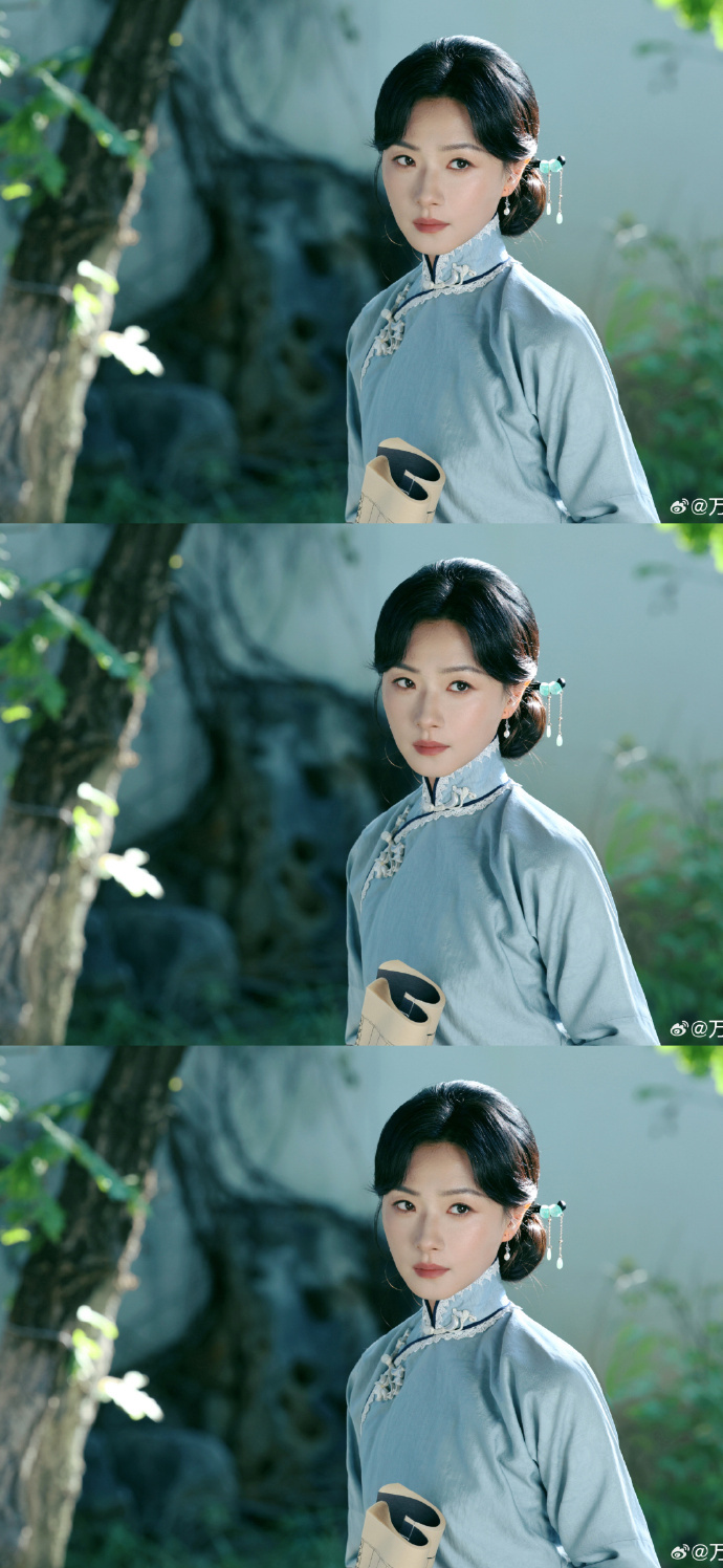 万茜民国白月光造型 太戳人!雾蓝旗袍衬出江南气韵,眼神清醒又坚定,温柔而有力量,这才是顶级民国氛围感。
