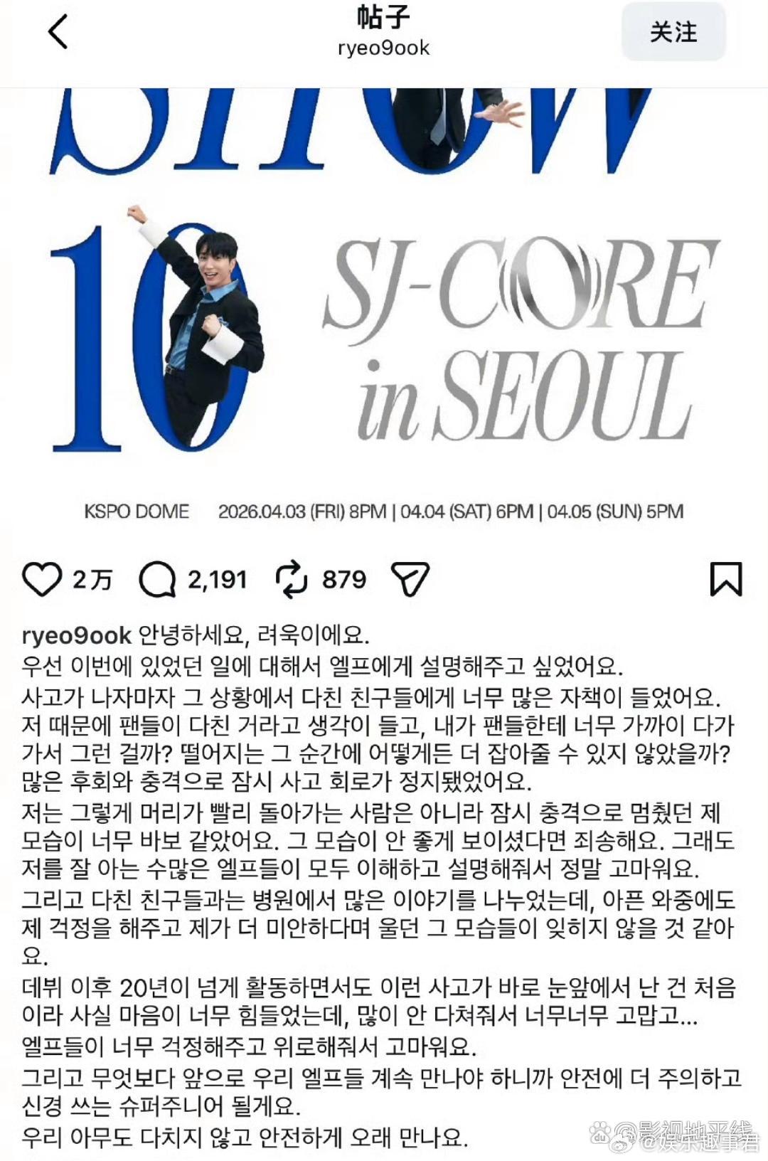 金厉旭就演唱会粉丝坠落事故发长文道歉。他称对现场受伤的粉丝充满了强烈的自责:“我并不是一个反应特别迅速的人,所以当时因为冲击而短暂失神的自己,也让我觉得十分笨拙。”并称已经在医院与受伤的粉丝们进行了长时间的交流。