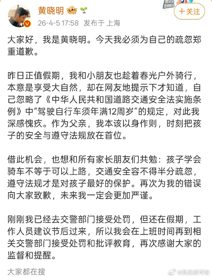 被黄晓明反向普法了假期刚结束就独自去交警队,口罩帽子裹得严实,但认错的态度看着一点也不隐身啊,这回大众都知道不满十二岁不能骑自行车了!