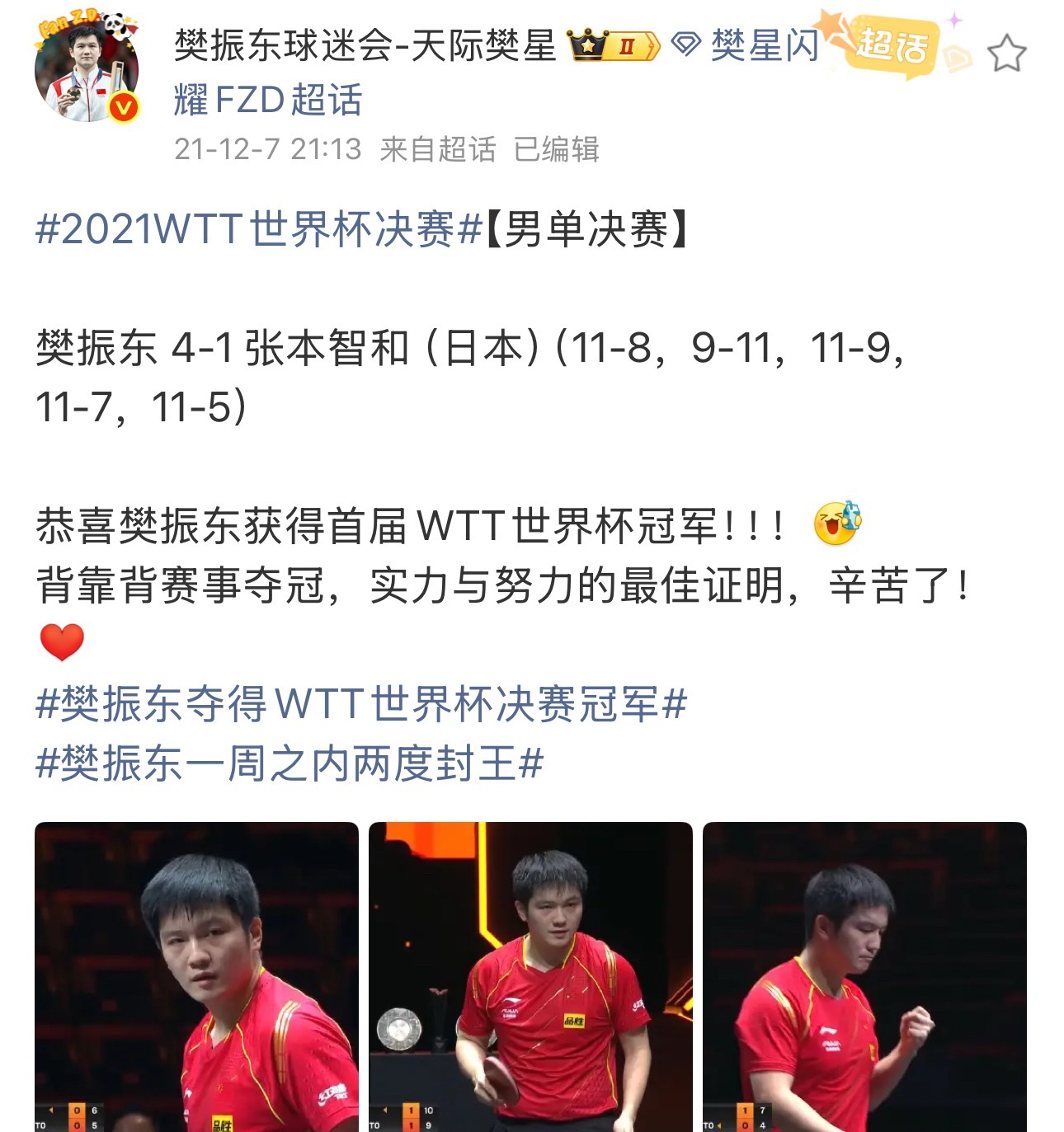 樊振东【7天】内拿下【休斯敦世乒赛➕世界杯冠军】樊振东【首位且唯一世界杯四连冠】(18、19、20、21)樊振东【首届不限二世界杯冠军】且【独守全区】樊振东【首位且唯一】【世界杯男单五冠王】确定要这样给樊振东吹成绩吗?一个比不过想再骰一个发现别人又多了一个冠军