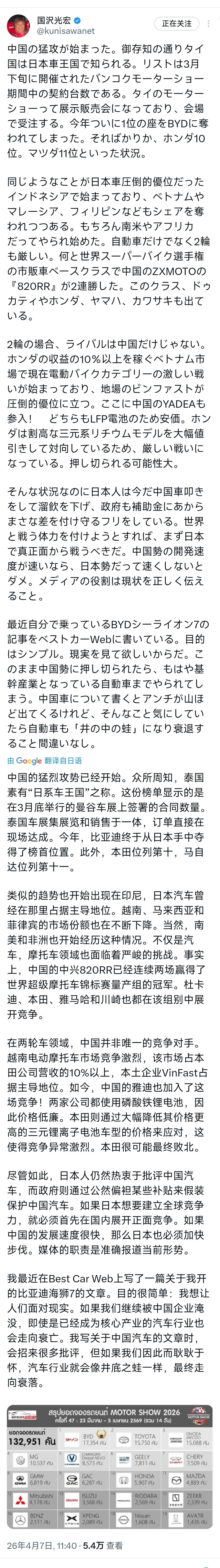 日本汽车评论家国泽光宏今天(4月7日)发文写道:“中国的猛烈攻势开始了。众所周知,泰国素有‘日本车王国’之称。这份清单是3月下旬在曼谷车展期间签订的订单数量。泰国的车展实际上就是展示与销售相结合的活动,在展会现场直接接单。今年,比亚迪终于夺走了第一名的宝座。不仅如此,本田跌至第10位,马自达更是排到了第11位。 类似的情况也正在印度尼西亚上演,那里曾是日本车的绝对优势市场,如今越南、马来西亚和菲律宾等地的市场份额也在不断被侵蚀。当然,南美洲和非洲也未能幸免。不仅汽车领域面临压力,摩托车行业同样形势严峻。甚至在世界超级摩托车锦标赛的市售车型组别中,中国品牌张雪摩托的‘820RR’实现了两连胜。该组别中还有杜卡迪、本田、雅马哈和川崎等大牌厂商参赛。 在两轮车市场,本田面临的竞争对手并非只有中国。目前,在为本田贡献了超过10%营收的越南市场,电动摩托车领域的激烈竞争已经打响,越南本土品牌VinFast占据了绝对优势。如今,中国的雅迪(YADEA)也加入了战局!由于双方都采用成本较低的LFP电池,产品价格更具竞争力。而本田则不得不大幅降价其价格较高的三元锂电池车型以应对,导致市场竞争异常激烈,本田很可能被压制。 在这种形势下,日本人却仍在一味地攻击中国车以求心理平衡,政府也假装通过补贴政策来维持表面的差距。如果要增强与世界竞争的实力,首先应该在日本本土正面对抗。如果中国企业的开发速度很快,那么日本企业也必须加快步伐。媒体的职责是如实报道现状。 最近我在Best Car Web上发表了一篇关于自己驾驶的比亚迪海狮7(BYD Seal 7)的文章。目的很简单:希望人们能正视现实。如果继续被中国品牌压制下去,连作为支柱产业的汽车产业也难逃被取代的命运。虽然写关于中国车的文章会招来大量反对声音,但如果一味在意这些负面反应,汽车产业势必会像‘井底之蛙’一样陷入衰退。” [机智]评几句:国泽光宏堪称日本汽车界的“清醒异类”。他亲身试驾比亚迪,痛批行业逃避现实,这份直面现状的勇气,在一众掩耳盗铃的声音中显得格外珍贵。如果日本车企都能有他这般认知,或许就能早一步摆脱困局,也不至于落得如今被动挨打的境地。 国人对日系车的情怀刻在骨子里,上世纪六七十年代出生者更是将其奉为神话。可时移世易,日系车在中国市场断崖式下滑已成定局:年轻人撕掉了传统滤镜,不再为“省油耐造”买单;中国自主品牌强势崛起,智能化、电动化与性价比全面反超,让日系车的优势荡然无存。 遗憾的是,国泽光宏的清醒难抵行业积弊。日本国内仍有不少人攻击中国车企自我安慰,政府靠补贴维持虚假优势,全然不愿承认转型迟缓的事实。他直言“别做井底之蛙”,却招来大量反对。这份孤独的呐喊,恰恰戳中了日系产业最致命的软肋——不愿正视现实的傲慢,终将让昔日神话彻底陨落。 当然,从我们的角度来看,希望国泽光宏这类“清醒者”能够更少一点,而日本的“井底之蛙”能够更多一些,再多一些……