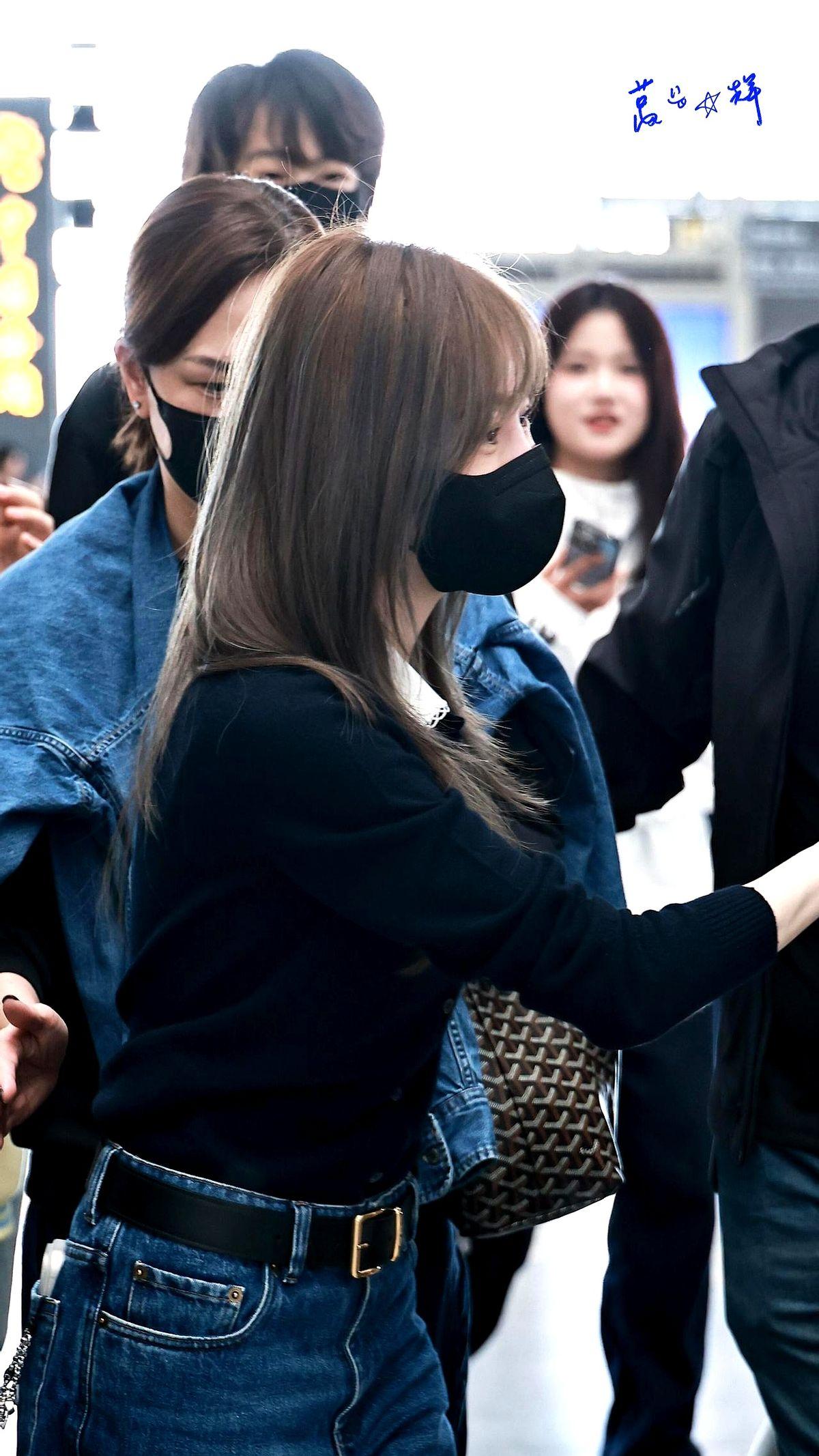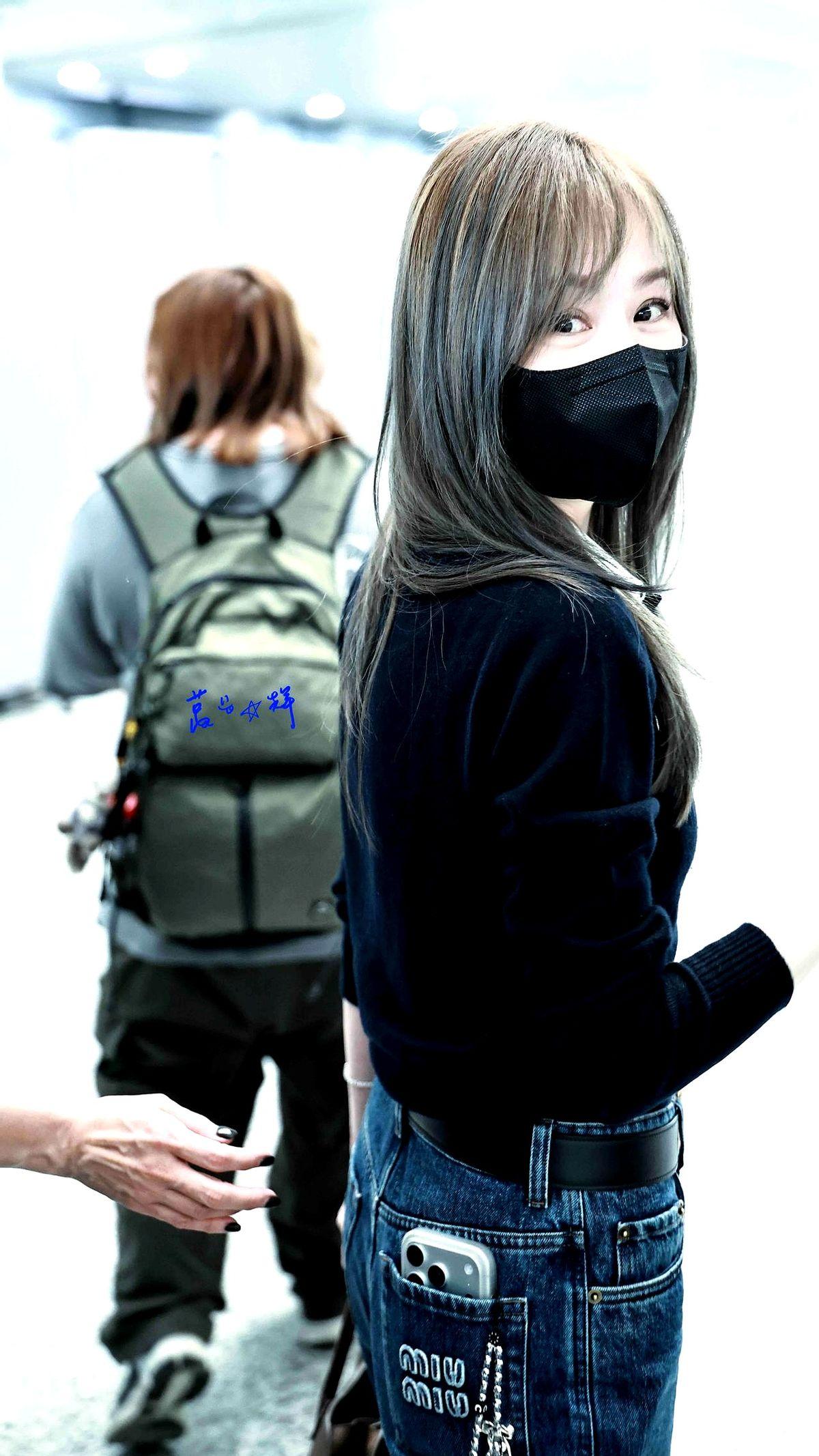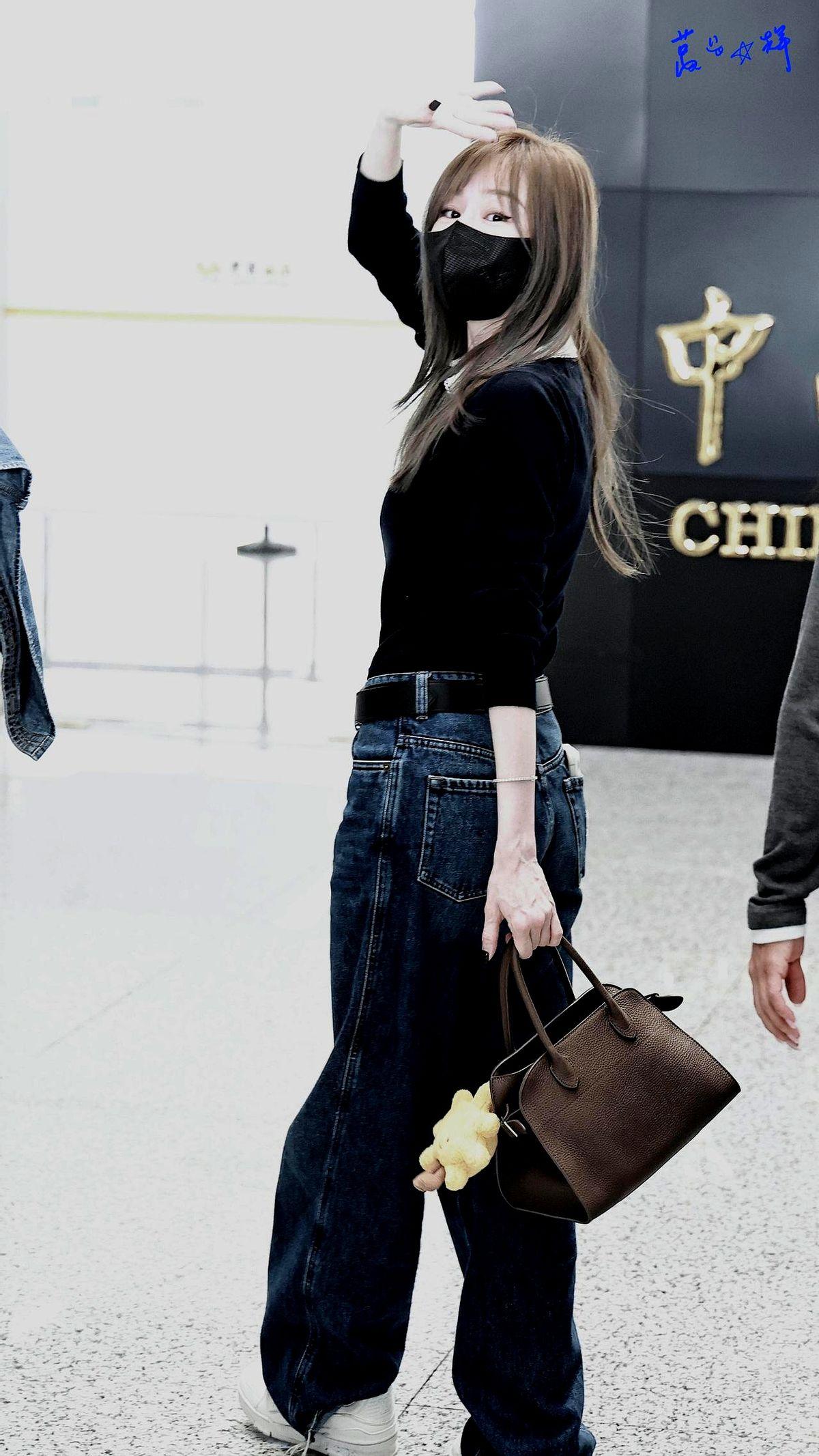 她机场这身,简直就是普通人穿搭天花板。一件普普通通的黑色针织衫,配上高腰直筒牛仔裤,就这么简单。