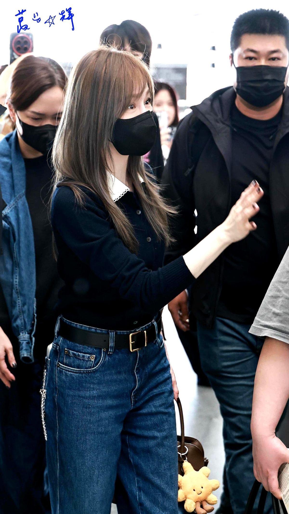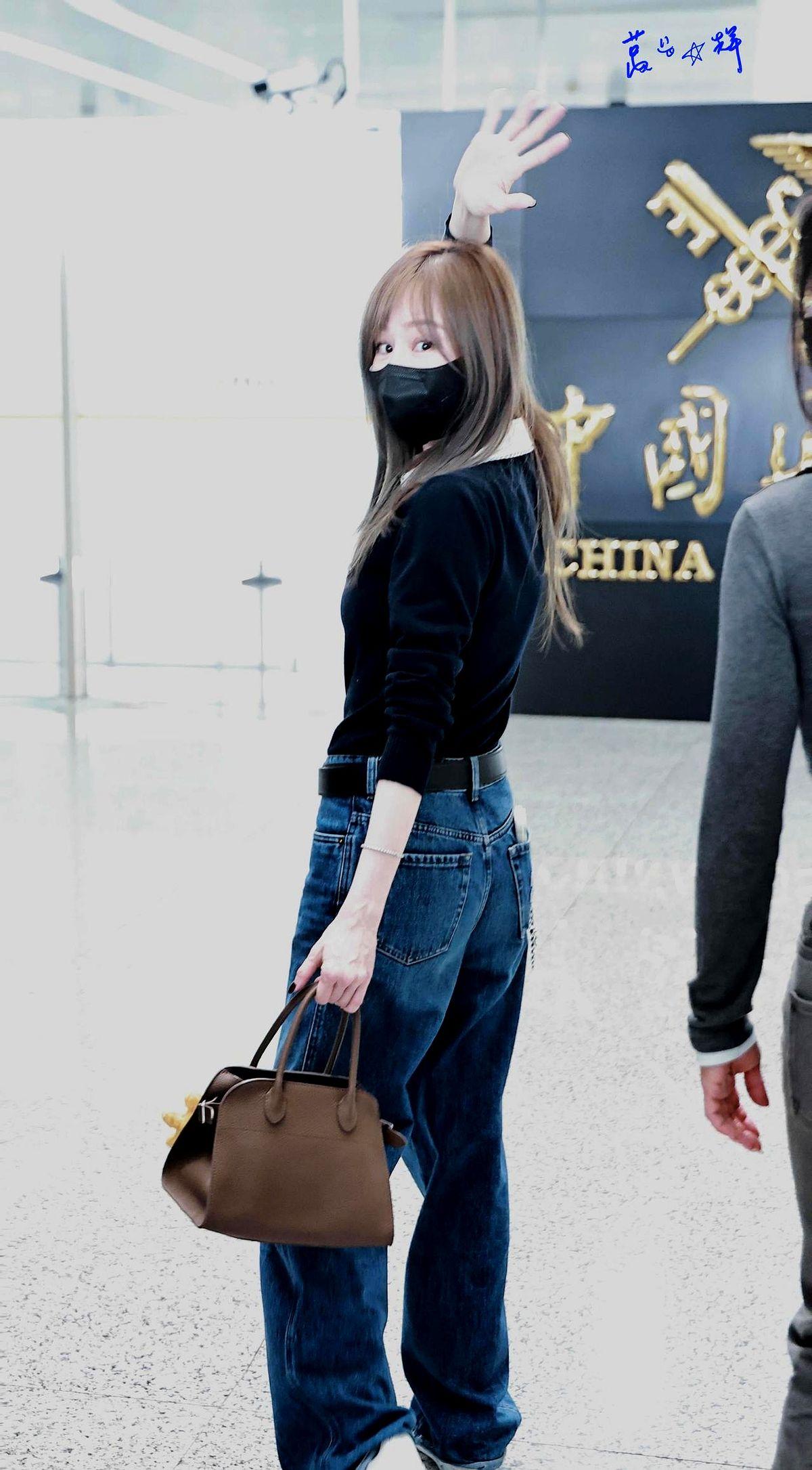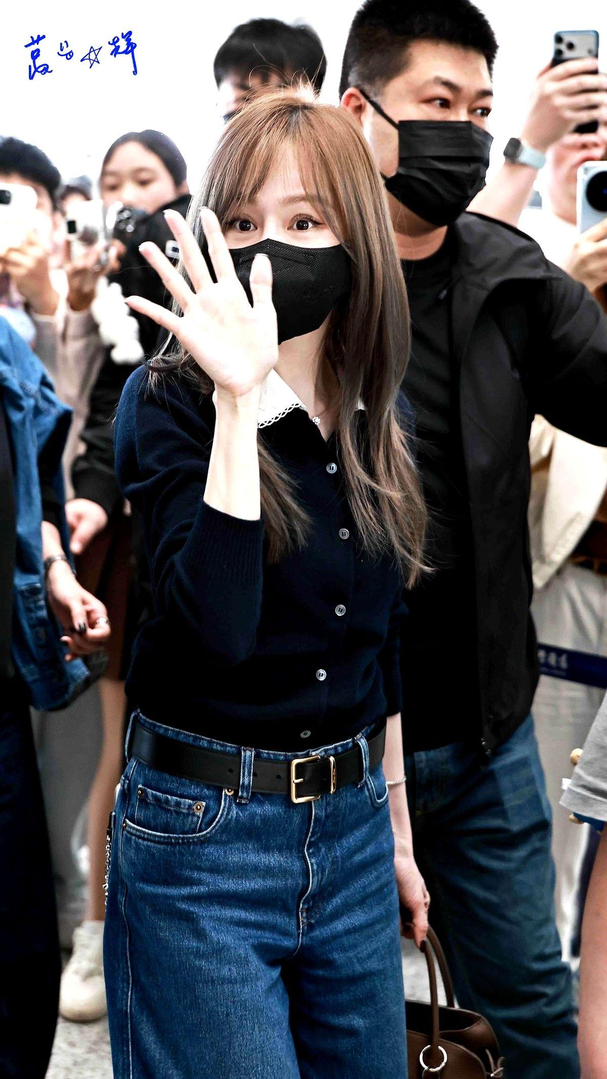 之前在郑州机场,她也是藏蓝色Polo衫配阔腿牛仔裤,主打一个舒适显高。她真的太会用基础款了!