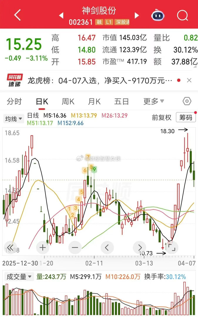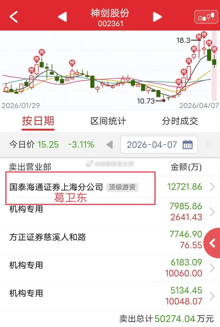 葛卫东出货1.2亿!今天神剑股份继续下跌,盘中冲高回落。盘后龙虎榜显示葛卫东卖出