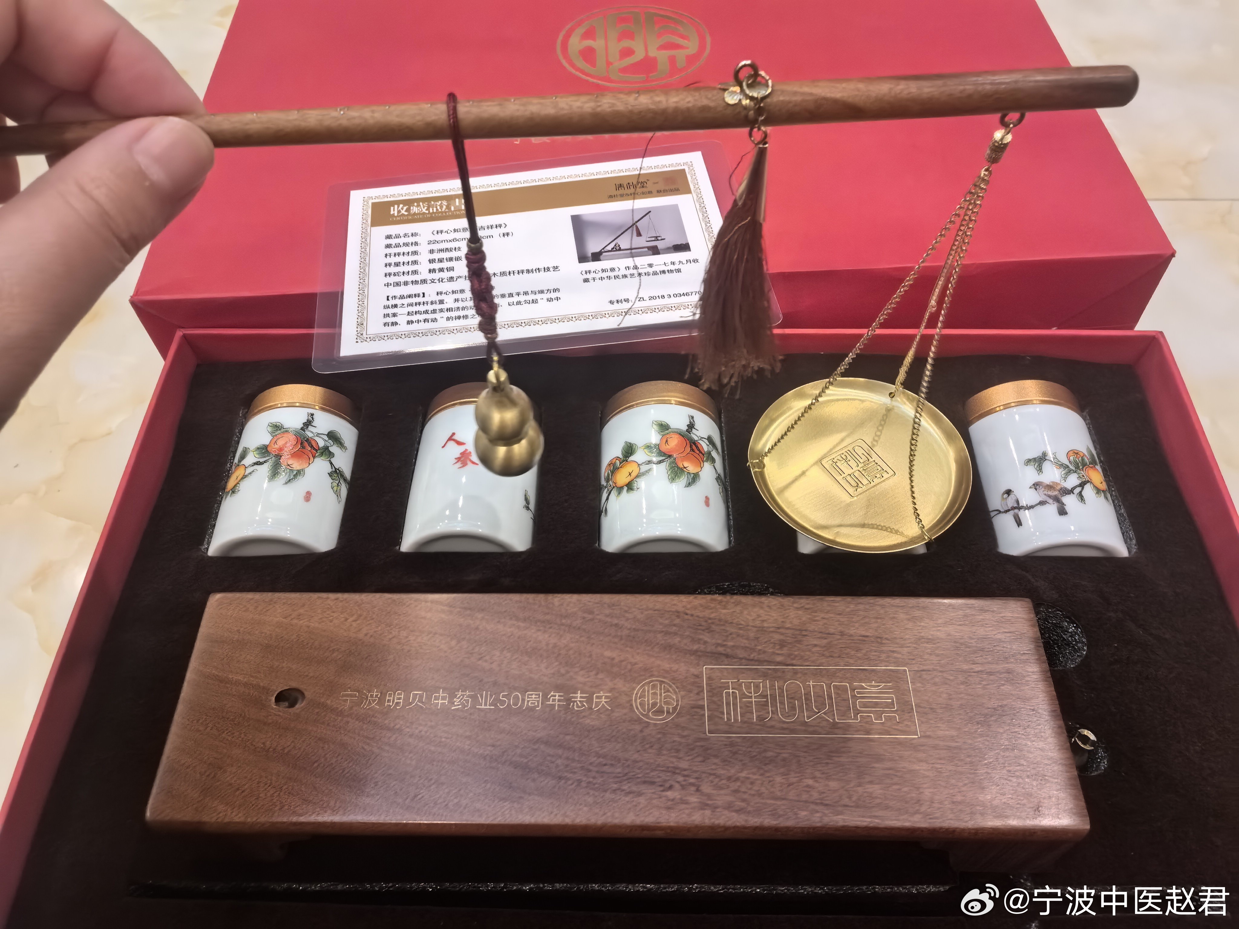 之前应邀去明贝堂参观,临走时张总客气,送了我们一份礼物,说是秤,我以为是普通的体重秤,一直没打开看。今晚打开一看,太意外了,竟然是宁波明贝中药业50周年志庆(1974年始创),老底子,果然不一样,雅,真雅