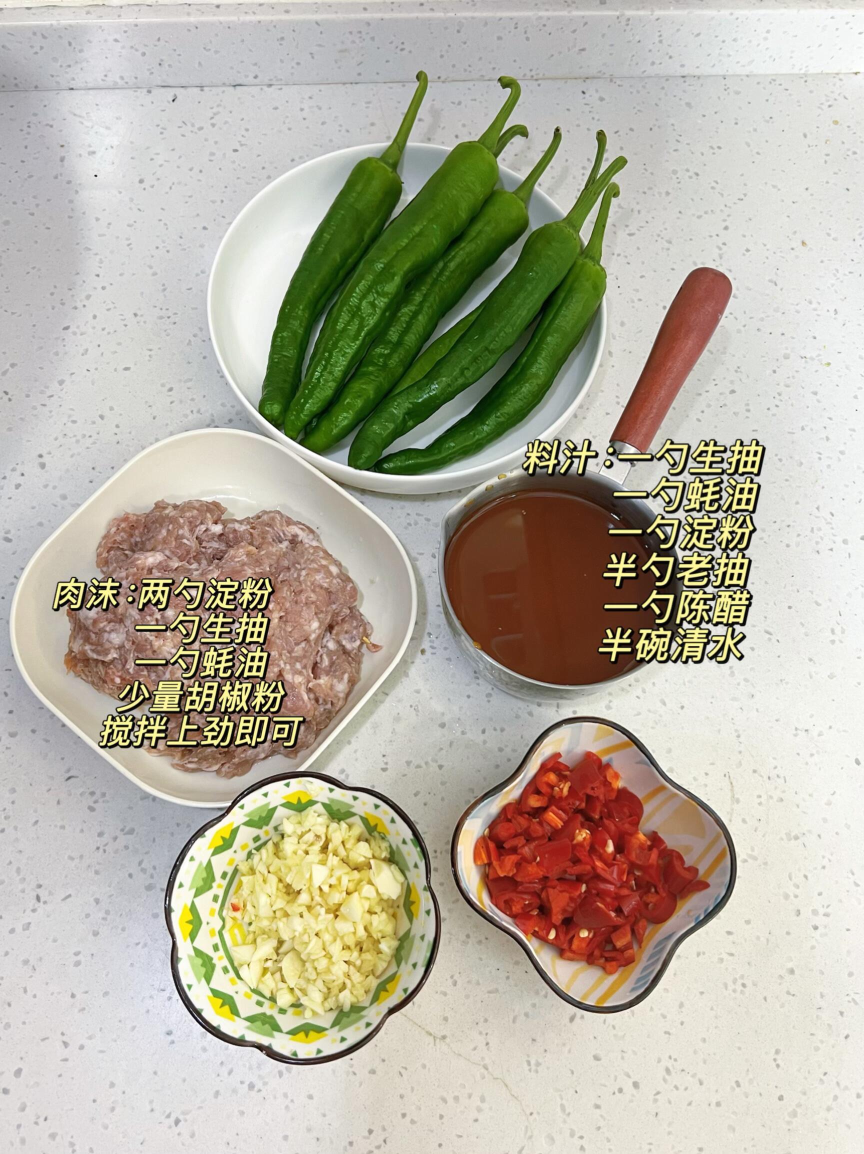 青椒尽量选直的薄皮尖椒(更容易煎出虎皮纹路,口感更脆嫩)、肉沫、蒜末、小米辣。