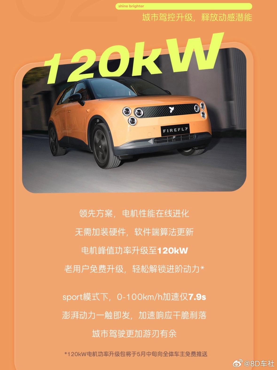 别急,还没完!往往压轴都在最后。此次升级最值得一看的是动力系统,免费升级!你没看错,动力免费提升。萤火虫电机峰值功率将从105kW提升至120kW,这将让这台纯电后驱小钢炮更具驾驶乐趣。特别让老车主感动的是,本次动力升级新老用户同享且免费。升级包将于5月中旬通过OTA向全体车主免费推送。firefly萤火虫自上市以来已经收获5万车主,这台纯电小车正在变得愈发有趣、有品。汽车资讯蔚来firefly萤火虫