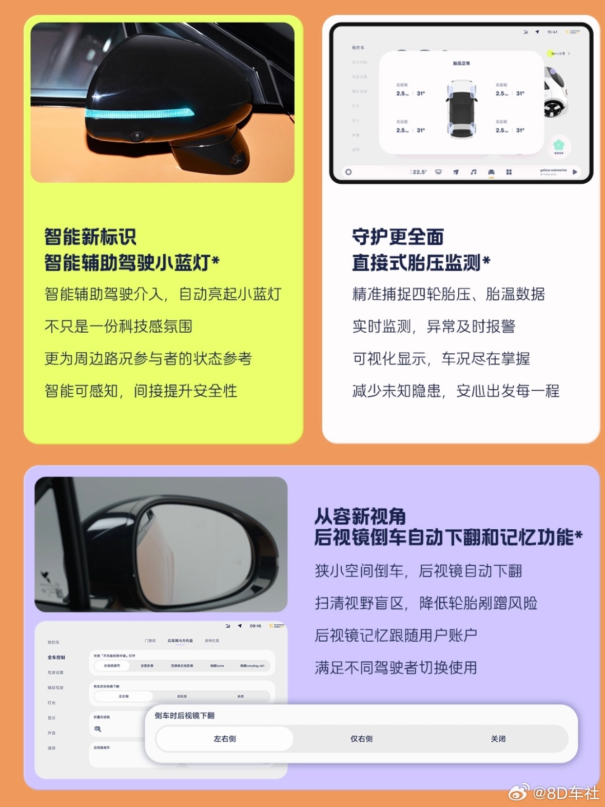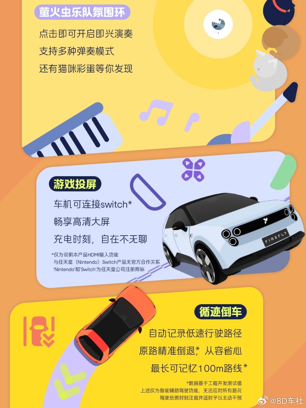 本次firefly萤火虫焕新升级主要亮点包括外观新增 "美拉德" 专属车色、星轨双色合金轮圈,外观更加炫酷个性。智能科技方面,全新aster紫菀 1.4.0 智能车机系统,将于4月8日上午10点全量推送。其中比较有意思的是车机上线了一个“乐队氛围环”,驻车等待的时候可以当作键盘弹奏乐曲。除了车内键盘可以演奏音乐之外,在灯语音效联动上也进一步升级,锁车时候可以有更多好玩的个性化体验。另外,新增Switch投屏功能会让游戏迷们惊喜。还有,生态应用中增加了NIO Radio,实现了非导航场景下地图上的红绿灯读秒,智能驾驶辅助功能中增加了100米循迹倒车以及误加速抑制辅助,还增加了紧急主动停车呼叫紧急救援服务。功能性方面,新增TPMS 胎压监测、后视镜倒车自动下翻及记忆、智能辅助驾驶小蓝灯等实用配置。驾驶模式新增轻缓、个性化等模式,优化了智能守卫模式以及守卫模式下的能耗,新增全景寻车以及起步环视影像等等。总之,让这台小车也做到智能且全能。
